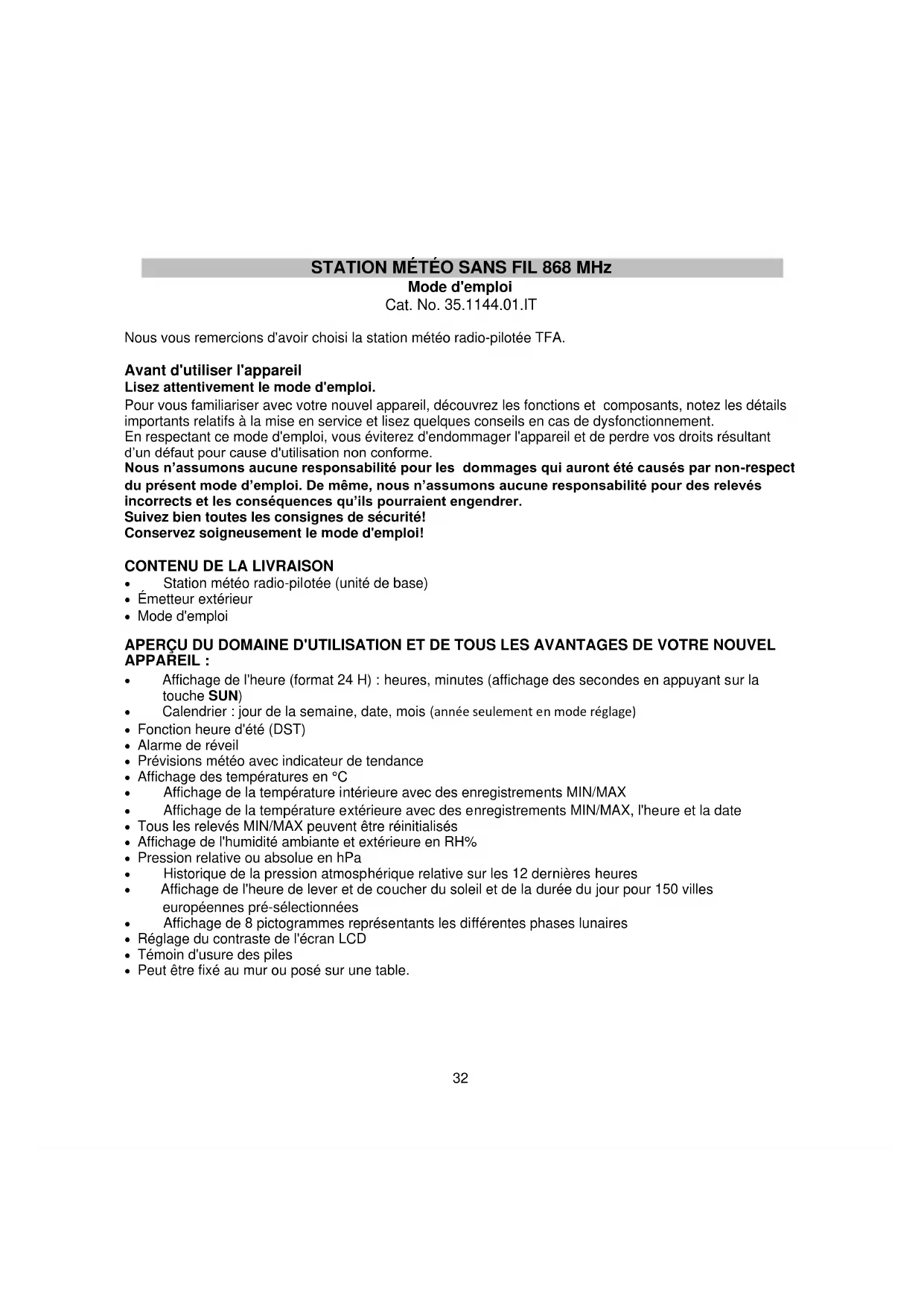 Nous vous remercions d'avoir choisi la station météo radio-pilotée TFA.