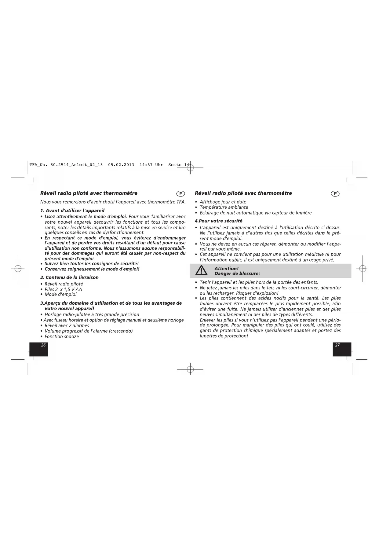 Les piles contiennent des acides nocifs pour la santé. Les piles faibles doivent être remplacées le plus rapidement possible, afin d'éviter une fuite. Ne jamais utiliser d'anciennes piles et des piles neuves simultanément ni des piles de types différents. Enlever les piles si vous n’utilisez pas l’appareil pendant une pério- de prolongée. Pour manipuler des piles qui ont coulé, utilisez des gants de protection chimique spécialement adaptés et portez des lunettes de protection! TFA_No. 60.2514_Anleit_02_13 05.02.2013 14:57 Uhr Seite 142928 Réveil radio piloté avec thermomètre
