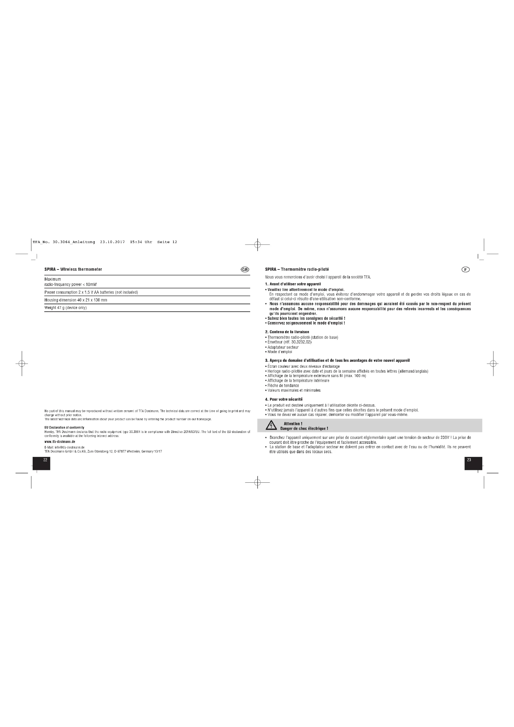 - La station de base et l'adaptateur secteur ne doivent pas entrer en contact avec de l'eau ou de l'humidité. Ils ne peuvent être utilisés que dans des locaux secs. TFA_No. 30.3064_Anleitung 23.10.2017 15:34 Uhr Seite 122524 SPIRA – Thermomètre radio-piloté