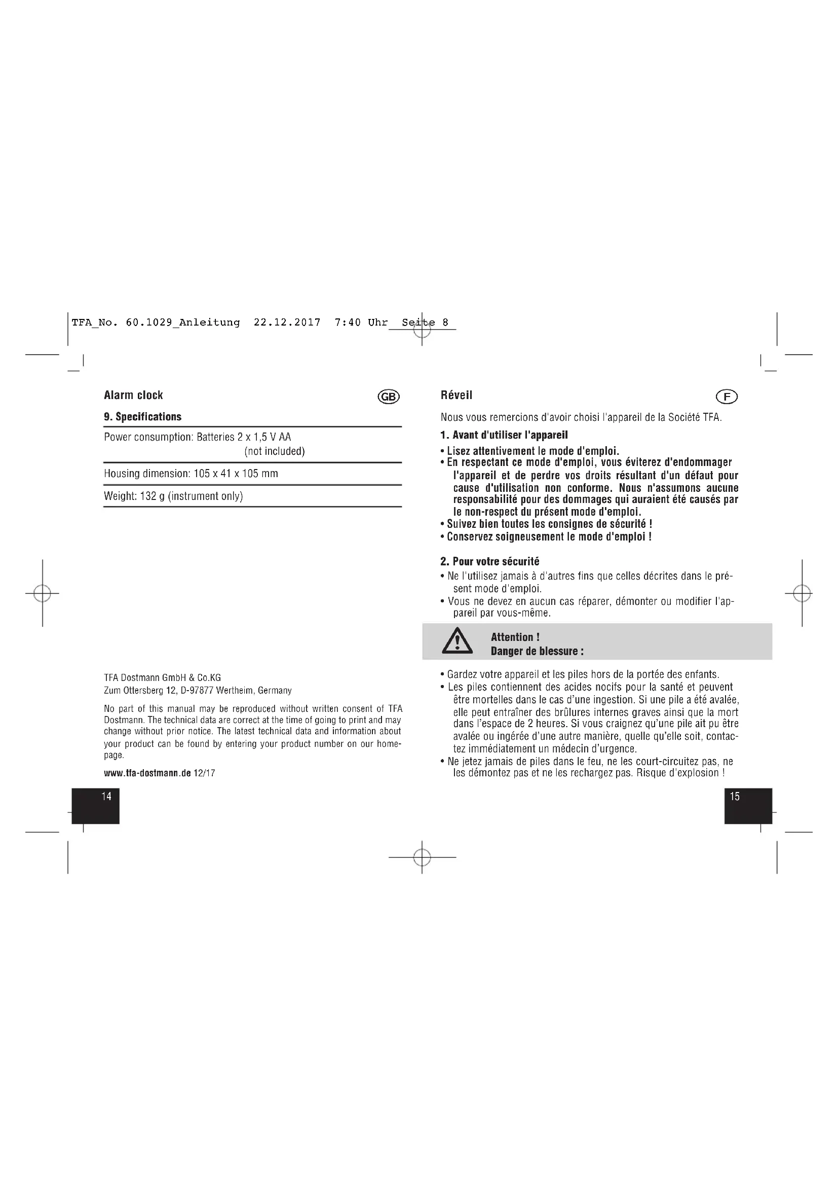 - Ne jetez jamais de piles dans le feu, ne les court-circuitez pas, ne les démontez pas et ne les rechargez pas. Risque d'explosion ! TFA_No. 60.1029_Anleitung 22.12.2017 7:40 Uhr Seite 81716 Réveil