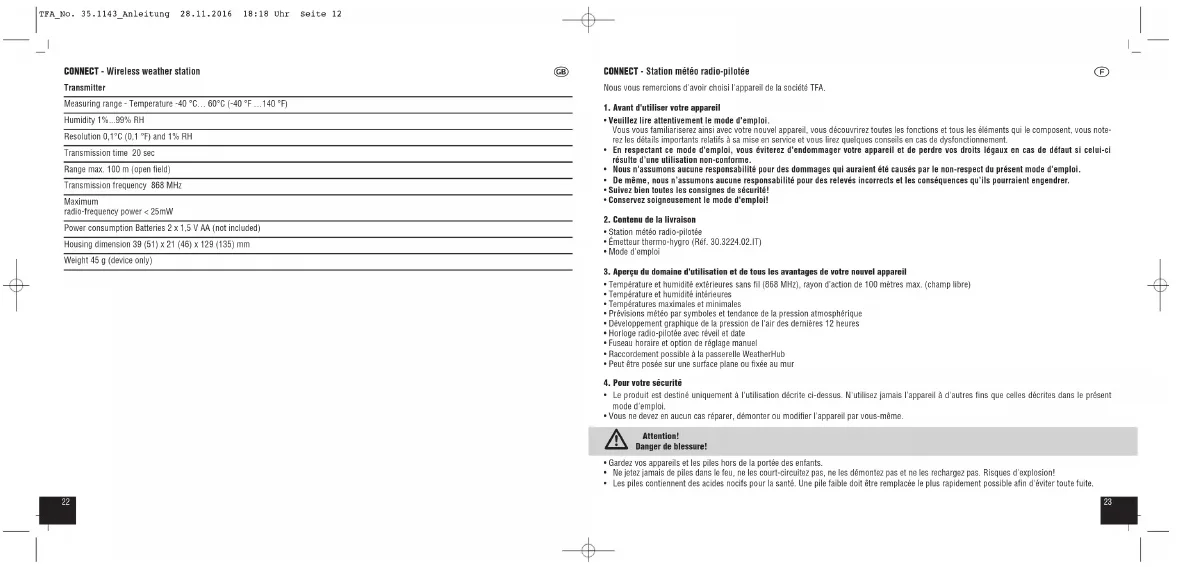 - Refermez soigneusement le compartiment à piles. TFA_No. 35.1143_Anleitung 28.11.2016 18:18 Uhr Seite 132726 CONNECT - Station météo radio-pilotée