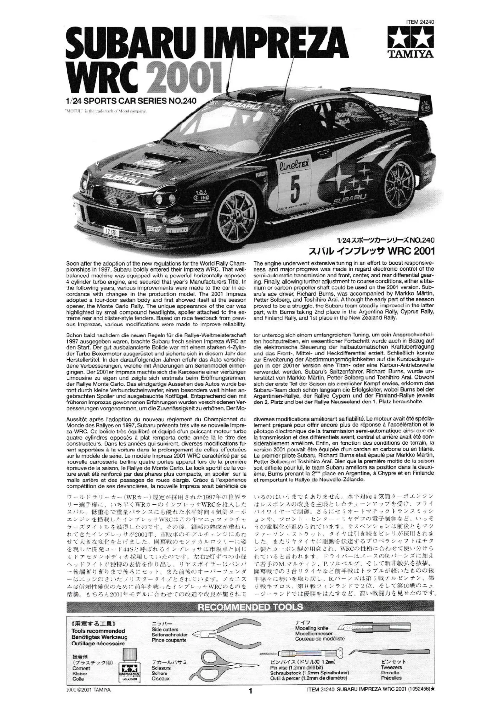 Subaru Impreza WRC 2001 - Jouets TAMIYA - Notice d'utilisation et mode d'emploi gratuit