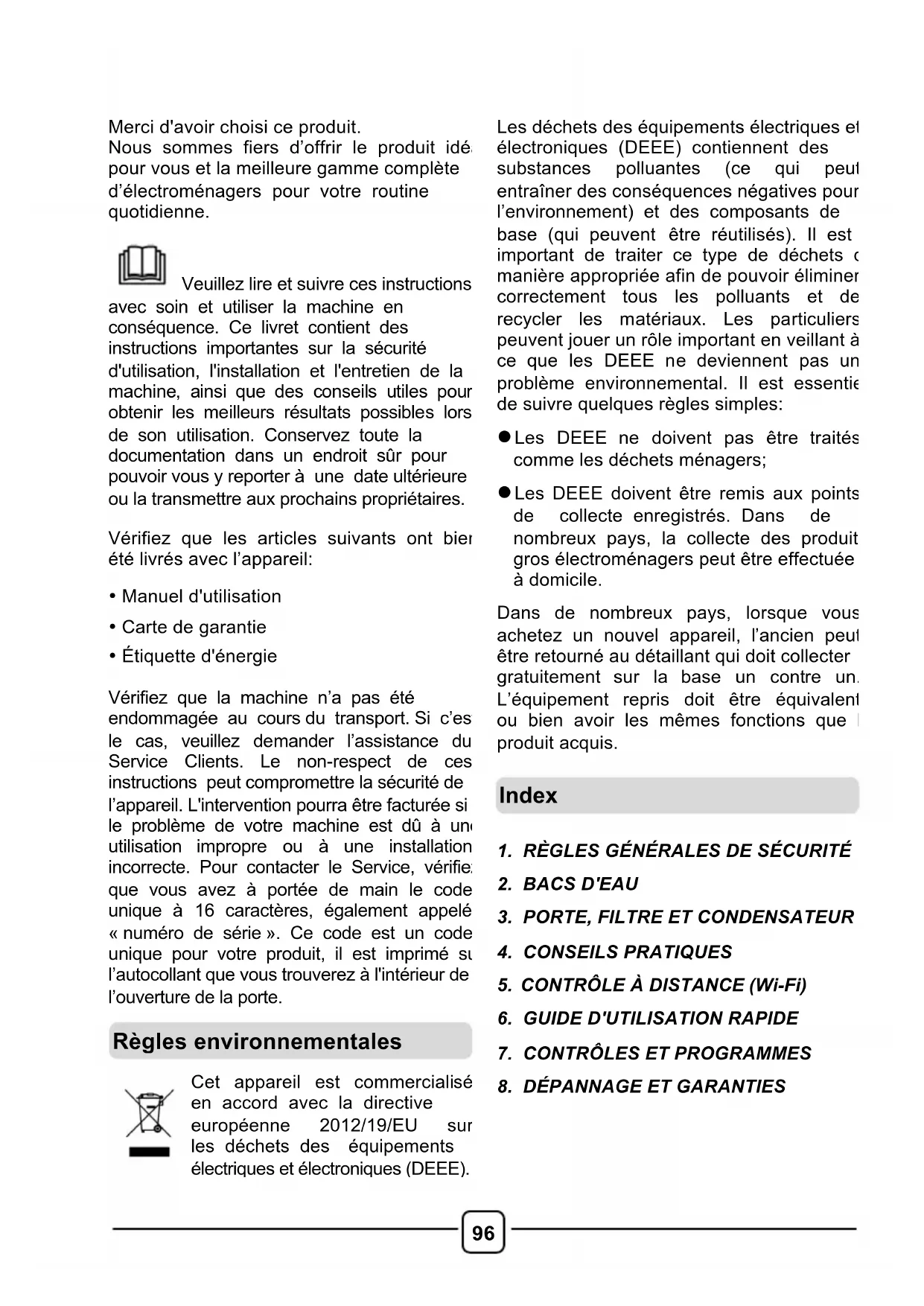 Merci d'avoir choisi ce produit. Nous sommes fiers d’offrir le produit idéal pour vous et la meilleure gamme complète d’électroménagers pour votre routine quotidienne. Veuillez lire et suivre ces instructions avec soin et utiliser la machine en conséquence. Ce livret contient des instructions importantes sur la sécurité d'utilisation, l'installation et l'entretien de la machine, ainsi que des conseils utiles pour obtenir les meilleurs résultats possibles lors de son utilisation. Conservez toute la documentation dans un endroit sûr pour pouvoir vous y reporter à une date ultérieure ou la transmettre aux prochains propriétaires. Vérifiez que les articles suivants ont bien été livrés avec l’appareil:
