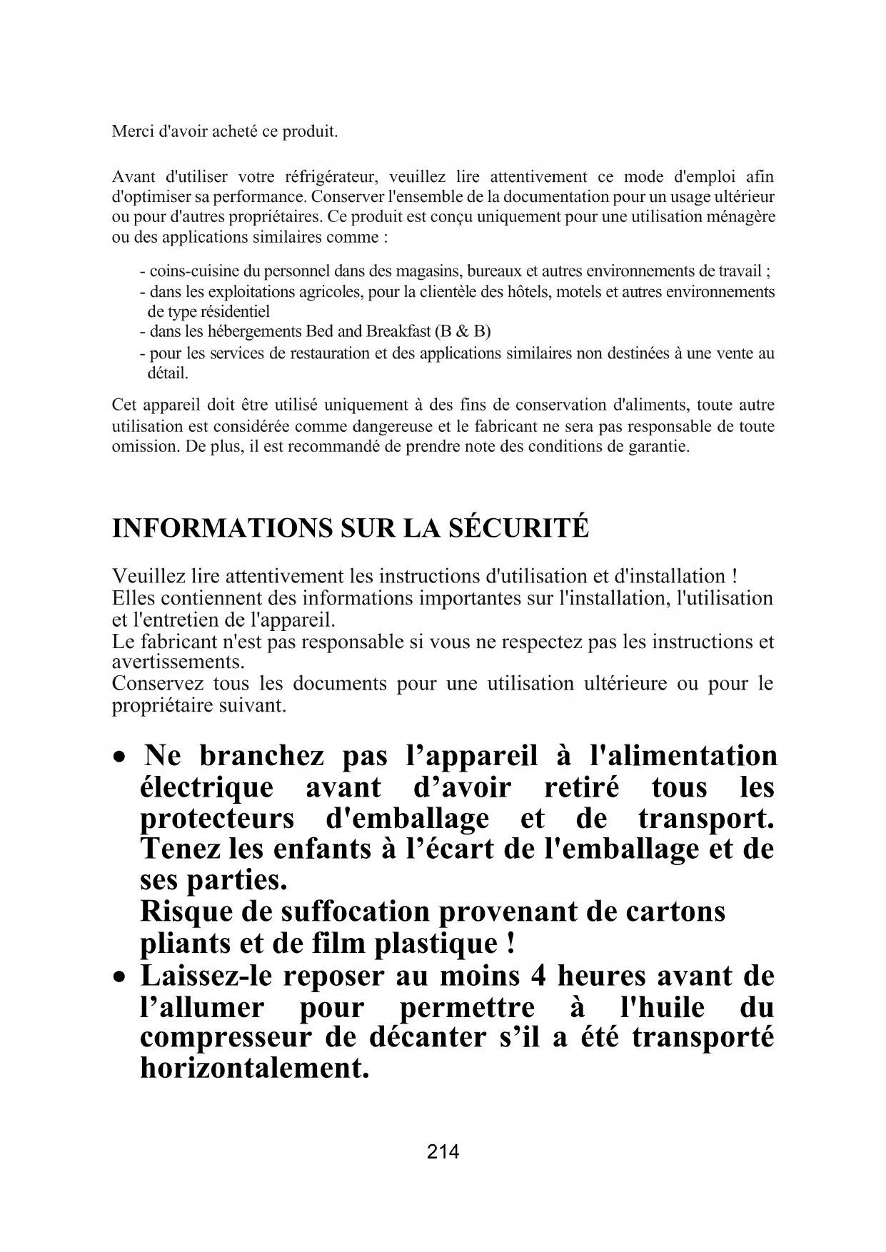 Merci d'avoir acheté ce produit. Avant d'utiliser votre réfrigérateur, veuillez lire attentivement ce mode d'emploi afin d'optimiser sa performance. Conserver l'ensemble de la documentation pour un usage ultérieur ou pour d'autres propriétaires. Ce produit est conçu uniquement pour une utilisation ménagère ou des applications similaires comme : - coins-cuisine du personnel dans des magasins, bureaux et autres environnements de travail ; - dans les exploitations agricoles, pour la clientèle des hôtels, motels et autres environnements de type résidentiel - dans les hébergements Bed and Breakfast (B & B) - pour les services de restauration et des applications similaires non destinées à une vente au détail. Cet appareil doit être utilisé uniquement à des fins de conservation d'aliments, toute autre utilisation est considérée comme dangereuse et le fabricant ne sera pas responsable de toute omission. De plus, il est recommandé de prendre note des conditions de garantie.