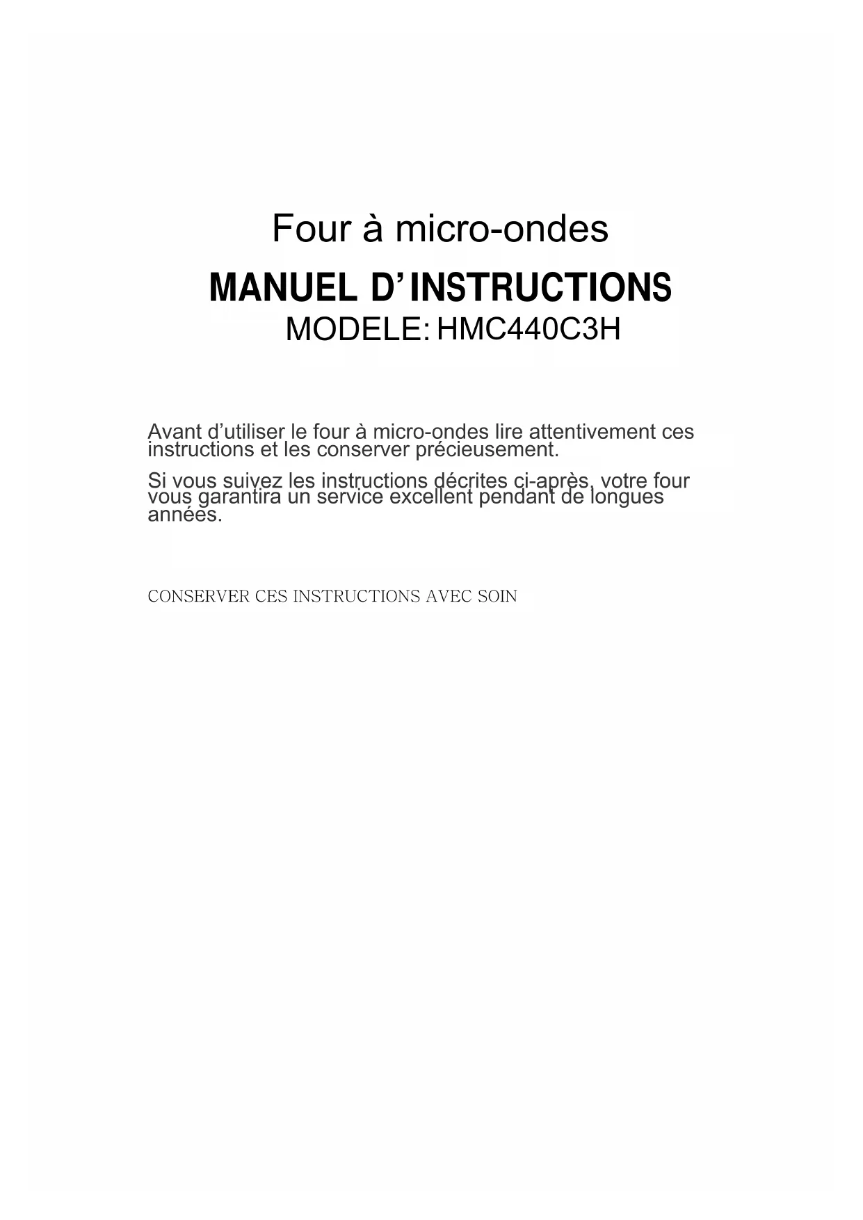 FR-2 HMC440C3HAfin de diminuer le risque d’incendie, court-circuit, dommages aux personnes ou exposition excessive à l’énergie des micro- ondes durant l’utilisation de l’appareil, nous vous conseillons de suivre les précautions de base suivantes: 1.Attention: Liquides ou autres aliments ne doivent pas être réchauffés dans des flacons fermés hermétiquement car ils sont susceptibles d’exploser. 2.Attention: il est dangereux pour tout personnel non spécialisé de démonter la couverture de protection prévue pour garantir la protection contre l’exposition à l’énergie à micro-ondes. 3.Attention: Ne permettez l’utilisation du four à des enfants qu’après leur avoir donné les instructions appropriées pour une correcte utilisation et les avoir mis en garde contre les risques encourus en cas d’une utilisation inappropriée. 4.Attention: Quand le four est utilisé en mode combiné, les enfants ne peuvent l’utiliser qu’en présence d’un adulte ceci en raison de la température émise (seulement pour le modèle avec grill)