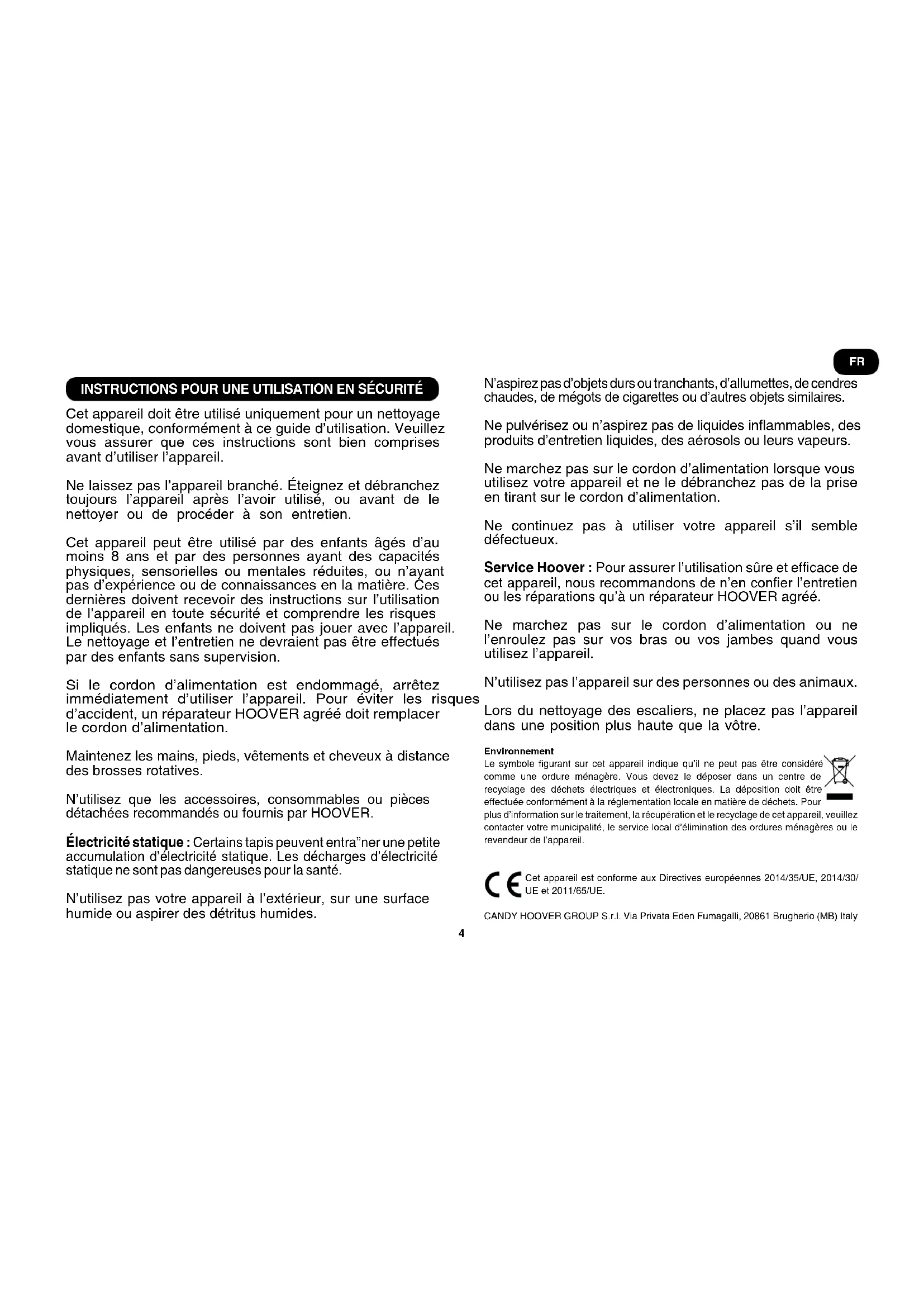 - Certain Models Only ** May vary according to model GB4 INSTRUCTIONS POUR UNE UTILISATION EN SÉCURITÉ Cet appareil doit être utilisé uniquement pour un nettoyage domestique, conformément à ce guide d’utilisation. Veuillez vous assurer que ces instructions sont bien comprises avant d’utiliser l’appareil. Ne laissez pas l’appareil branché. Éteignez et débranchez toujours l’appareil après l’avoir utilisé, ou avant de le nettoyer ou de procéder à son entretien. Cet appareil peut être utilisé par des enfants âgés d’au moins 8 ans et par des personnes ayant des capacités physiques, sensorielles ou mentales réduites, ou n’ayant pas d’expérience ou de connaissances en la matière. Ces dernières doivent recevoir des instructions sur l’utilisation de l’appareil en toute sécurité et comprendre les risques impliqués. Les enfants ne doivent pas jouer avec l’appareil. Le nettoyage et l’entretien ne devraient pas être effectués par des enfants sans supervision. Si le cordon d’alimentation est endommagé, arrêtez immédiatement d’utiliser l’appareil. Pour éviter les risques d’accident, un réparateur HOOVER agréé doit remplacer le cordon d’alimentation. Maintenez les mains, pieds, vêtements et cheveux à distance des brosses rotatives. N’utilisez que les accessoires, consommables ou pièces détachées recommandés ou fournis par HOOVER. Électricité statique : Certains tapis peuvent entraîner une petite accumulation d’électricité statique. Les décharges d’électricité statique ne sont pas dangereuses pour la santé. N’utilisez pas votre appareil à l’extérieur, sur une surface humide ou aspirer des détritus humides. N’aspirez pas d’objets durs ou tranchants, d’allumettes, de cendres chaudes, de mégots de cigarettes ou d’autres objets similaires. Ne pulvérisez ou n’aspirez pas de liquides inammables, des produits d’entretien liquides, des aérosols ou leurs vapeurs. Ne marchez pas sur le cordon d’alimentation lorsque vous utilisez votre appareil et ne le débranchez pas de la prise en tirant sur le cordon d’alimentation. Ne continuez pas à utiliser votre appareil s’il semble défectueux. Service Hoover : Pour assurer l’utilisation sûre et efcace de cet appareil, nous recommandons de n’en coner l’entretien ou les réparations qu’à un réparateur HOOVER agréé. Ne marchez pas sur le cordon d’alimentation ou ne l’enroulez pas sur vos bras ou vos jambes quand vous utilisez l’appareil. N’utilisez pas l’appareil sur des personnes ou des animaux. Lors du nettoyage des escaliers, ne placez pas l’appareil dans une position plus haute que la vôtre. Environnement Le symbole gurant sur cet appareil indique qu’il ne peut pas être considéré comme une ordure ménagère. Vous devez le déposer dans un centre de recyclage des déchets électriques et électroniques. La déposition doit être effectuée conformément à la réglementation locale en matière de déchets. Pour plus d’information sur le traitement, la récupération et le recyclage de cet appareil, veuillez contacter votre municipalité, le service local d’élimination des ordures ménagères ou le revendeur de l’appareil. Cet appareil est conforme aux Directives européennes 2014/35/UE, 2014/30/ UE et 2011/65/UE. CANDY HOOVER GROUP S.r.l. Via Privata Eden Fumagalli, 20861 Brugherio (MB) Italy FR5