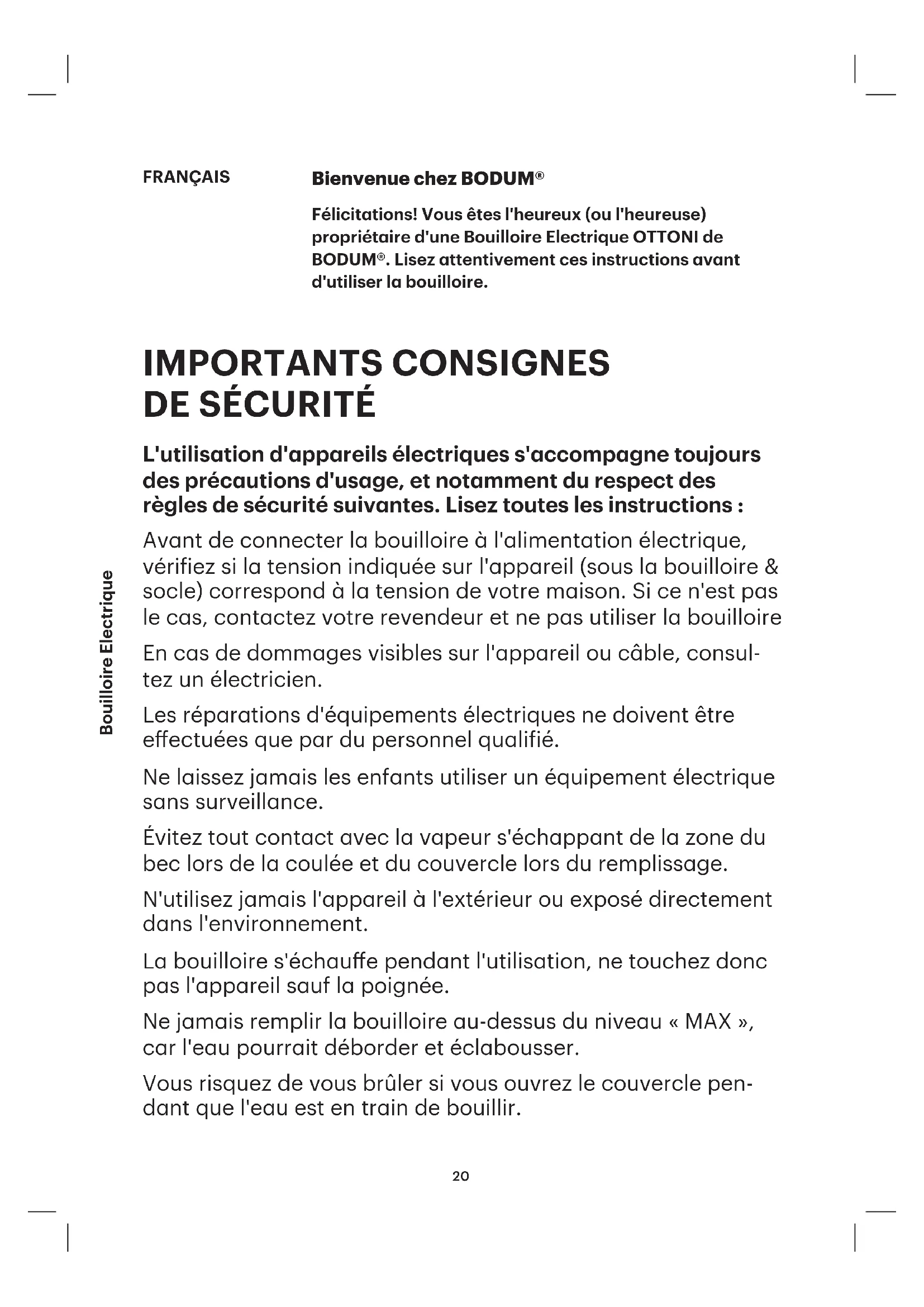 Félicitations ! Vous êtes l'heureux (ou l'heureuse) propriétaire d'une Bouilloire Électrique OTTONI de BODUM®. Lisez attentivement ces instructions avant d'utiliser la bouilloire.