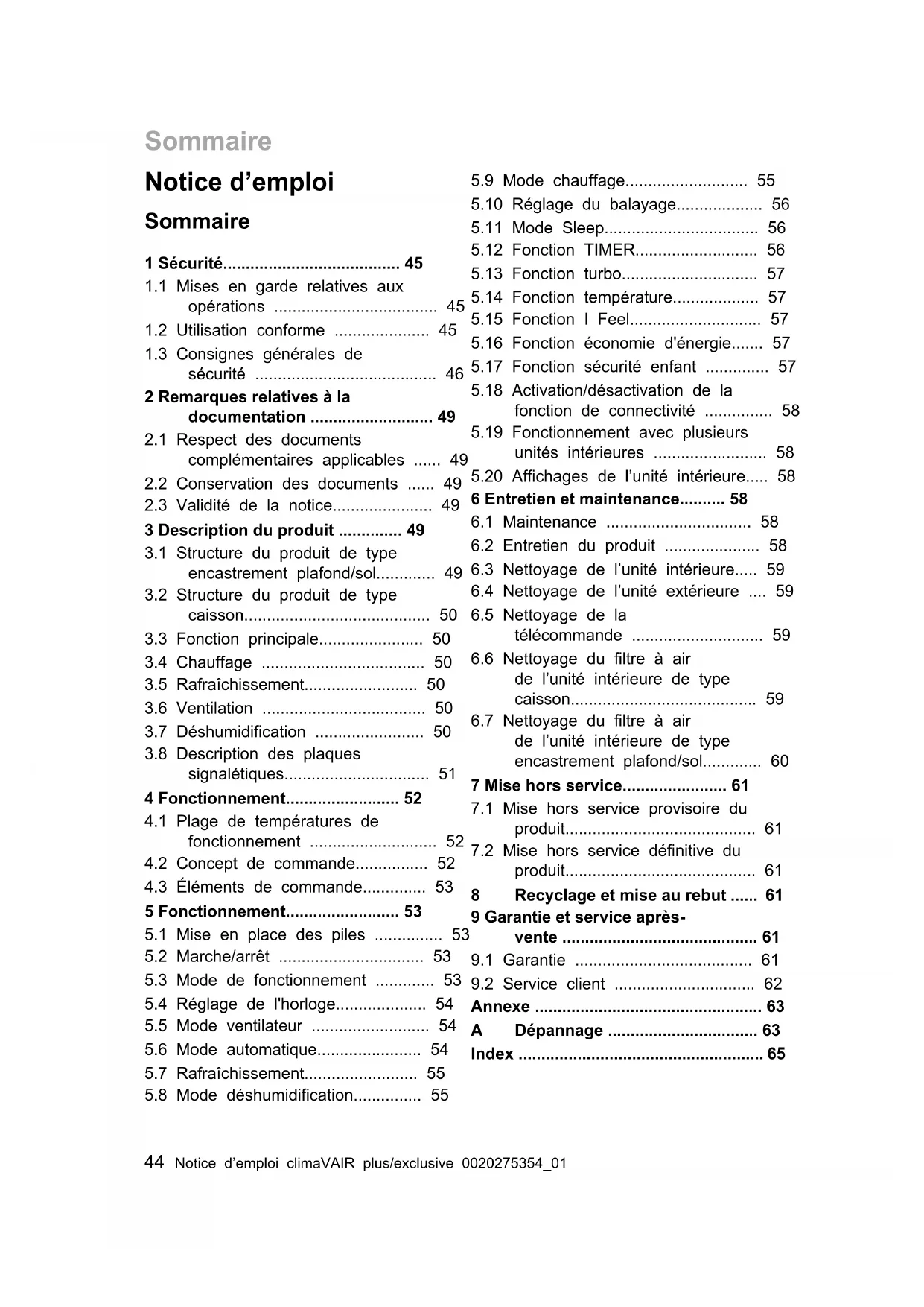 Les coordonnées de notre service client sont indiquées au verso ou sur notre site Internet.Annexe 0020275354_01 climaVAIR plus/exclusive Notice d’emploi 63 Annexe A Dépannage Problème Causes possibles Action corrective L'écran de la commande à dis- tance ne s'allume pas Vérifiez que les piles sont correctement positionnées Respectez la polarité Les piles sont déchargées Remplacer les piles. Remplacez systématiquement les 2 piles en même temps. Le système ne se remet pas immédiatement en marche Le système ne redémarre pas immédia- tement après une mise à l'arrêt. Chaque fois que l’installation est arrêtée, elle reste coupée au moins 3 minutes pour ne pas subir de dommages. Attendez ce délai avant de la remettre sous tension. Le circuit de protection se déclenche pour protéger le produit lorsque la fiche est retirée puis réintroduite directement dans la prise de courant. Le système ne fonctionne pas du tout (la venti- lation ne se met pas en route) Le câble d'alimentation n'est pas bran- ché Introduisez la fiche dans la prise de courant et mettez l'unité inté- rieure en marche Une coupure de courant est survenue Rétablissez l'alimentation élec- trique de l'installation Le fusible est défectueux Contactez un installateur spécia- lisé Refroidissement ou chauffage insuffisant Portes et/ou fenêtres ouvertes Fermez les portes et/ou les fe- nêtres Présence d'une source de chaleur dans la pièce (nombreuses personnes dans la pièce) Éliminez la source de chaleur si possible Le thermostat est réglé sur une tempé- rature trop élevée en mode refroidisse- ment Régler idéalement la température Le thermostat est réglé sur une tempé- rature trop basse en mode chauffage Régler idéalement la température Le filtre à air est encrassé ou obstrué Nettoyez les filtres à air. Présence d'un obstacle devant l'entrée ou la sortie d'air Retirez l'obstacle pour bénéficier d'une bonne circulation d'air La température ambiante n'a pas atteint le niveau fixé Patientez quelques instants Les rayons du soleil pénètrent directe- ment par la fenêtre pendant le fonction- nement du produit en mode refroidisse- ment Protégez l'unité intérieure du soleil (ex : installez un rideau, fermez les volets ...) Bruits Un crépitement peut être entendu pen- dant le fonctionnement ou l'arrêt de l'unité. C’est au cours des 2 - 3 pre- mières minutes que les bruits sont les plus forts. L'écoulement de fluide frigorigène dans l'unité est à l'origine de ce crépitement. Il ne s'agit pas d'un bruit lié à un dysfonctionnement.Annexe 64 Notice d’emploi climaVAIR plus/exclusive 0020275354_01 Problème Causes possibles Action corrective Bruits Un claquement se fait entendre pendant le fonctionnement du système Ce bruit est causé par les change- ments de température provoqués par la dilatation ou la contraction du caisson. Il ne s'agit pas d'un bruit lié à un dysfonctionnement. L'émission d'un fort bruit d'écoulement d'air pendant le fonctionnement du sys- tème peut être du à l'encrassement des filtres à air Nettoyez bien les filtres à air Dégagement d'odeurs Le système fait circuler les odeurs pré- sentes dans l'air de la pièce (odeurs de cigarette ou du mobilier) Pas d'action corrective Dégagement de brouilllard ou de vapeur L’unité extérieure peut dégager de la vapeur en cours de dégivrage quand elle est en mode chauffage ou que la température est basse. Pas d'action corrective L’écran de l’unité intérieure affiche E07 . Les différentes unités intérieures du système d'air conditionné ne sont pas toutes configurées avec le même mode Réglez toutes les unités inté- rieures en mode rafraîchissement ou en mode chauffageIndex 0020275354_01 climaVAIR plus/exclusive Notice d’emploi 65 Index