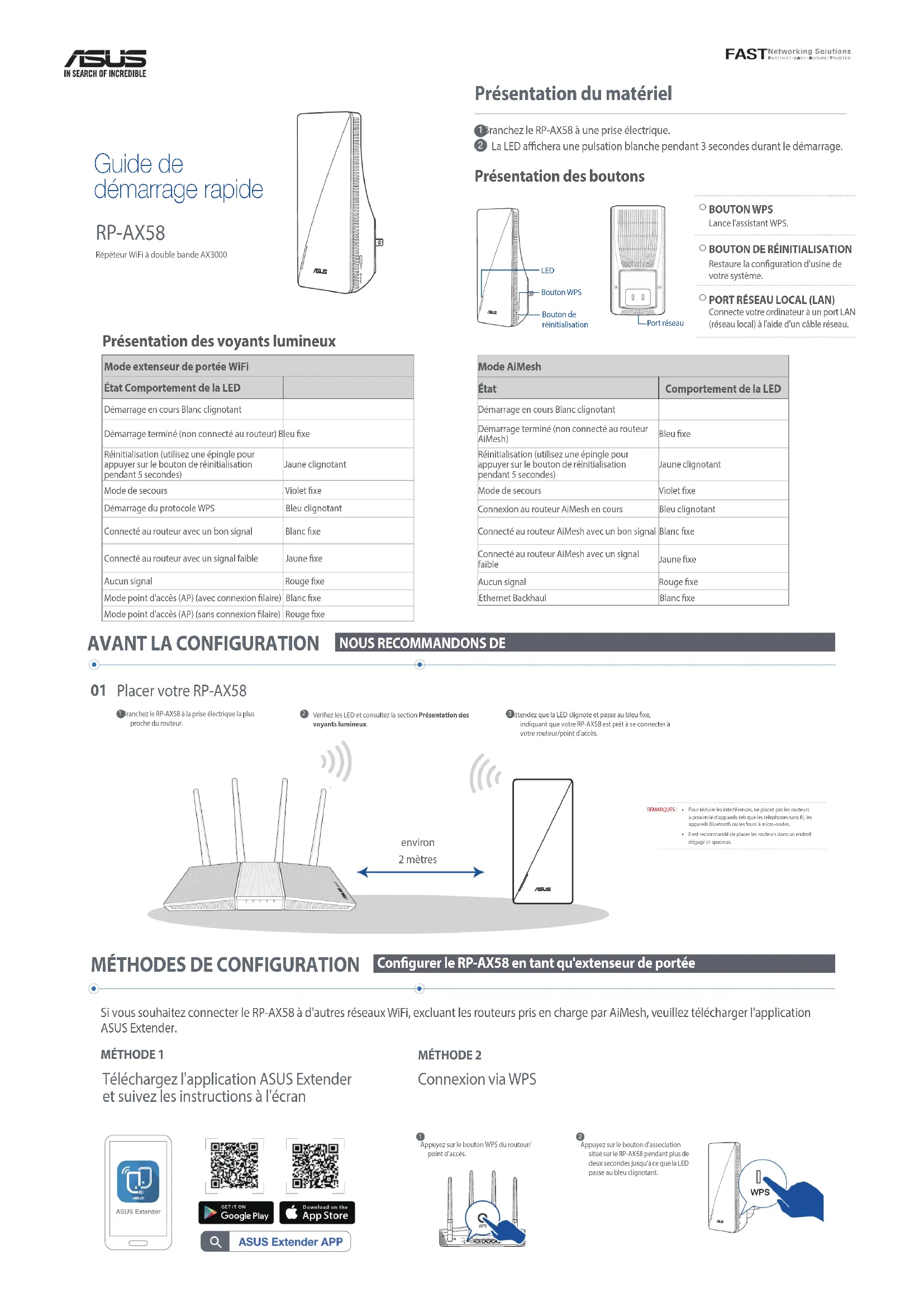 Placer votre RP-AX58 Branchez le RP-AX58 à la prise électrique la plus proche du routeur. Vériez les LED et consultez la section Présentation des voyants lumineux.MÉTHODE 1 Téléchargez l'application ASUS Extender et suivez les instructions à l'écran MÉTHODE 2 Connexion via WPS Appuyez sur le bouton WPS du routeur/point d'accès. Appuyez sur le bouton d'association situé sur le RP-AX58 pendant plus de deux secondes jusqu'à ce que la LED passe au bleu clignotant. RP-AX58 Répéteur WiFi à double bande AX3000 Guide de démarrage rapide Présentation du matériel Présentation des boutons BOUTON DE RÉINITIALISATIONRestaure la conguration d'usine de votre système.BOUTON WPSLance l'assistant WPS.PORT RÉSEAU LOCAL (LAN)Connecte votre ordinateur à un port LAN (réseau local) à l'aide d'un câble réseau.
