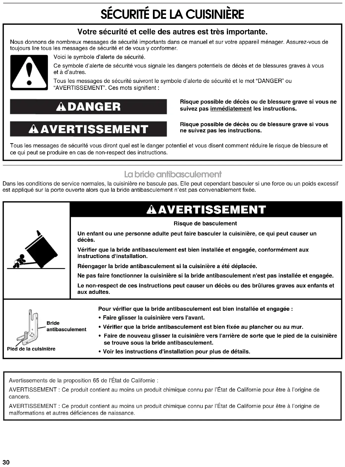 La bride antibasculement Dans les conditions de service normales, la cuisinière ne bascule pas. Elle peut cependant basculer si une force ou un poids excessif est appliqué sur la porte ouverte alors que la bride antibasculement n’est pas convenablement fixée. Risque possible de décès ou de blessure grave si vous ne suivez pas immédiatement les instructions. Risque possible de décès ou de blessure grave si vous ne suivez pas les instructions. Tous les messages de sécurité vous diront quel est le danger potentiel et vous disent comment réduire le risque de blessure et ce qui peut se produire en cas de non-respect des instructions. Votre sécurité et celle des autres est très importante. Nous donnons de nombreux messages de sécurité importants dans ce manuel et sur votre appareil ménager. Assurez-vous de toujours lire tous les messages de sécurité et de vous y conformer. AVERTISSEMENT DANGER Voici le symbole d’alerte de sécurité.Ce symbole d’alerte de sécurité vous signale les dangers potentiels de décès et de blessures graves à vous et à d’autres.Tous les messages de sécurité suivront le symbole d’alerte de sécurité et le mot “DANGER” ou “AVERTISSEMENT”. Ces mots signifient :Risque de basculementUn enfant ou une personne adulte peut faire basculer la cuisinière, ce qui peut causer un décès.Vérifier que la bride antibasculement est bien installée et engagée, conformément aux instructions d'installation.Réengager la bride antibasculement si la cuisinière a été déplacée.Ne pas faire fonctionner la cuisinière si la bride antibasculement n'est pas installée et engagée.Le non-respect de ces instructions peut causer un décès ou des brûlures graves aux enfants et aux adultes.Pour vérifier que la bride antibasculement est bien installée et engagée :• Faire glisser la cuisinière vers l'avant.• Vérifier que la bride antibasculement est bien fixée au plancher ou au mur.