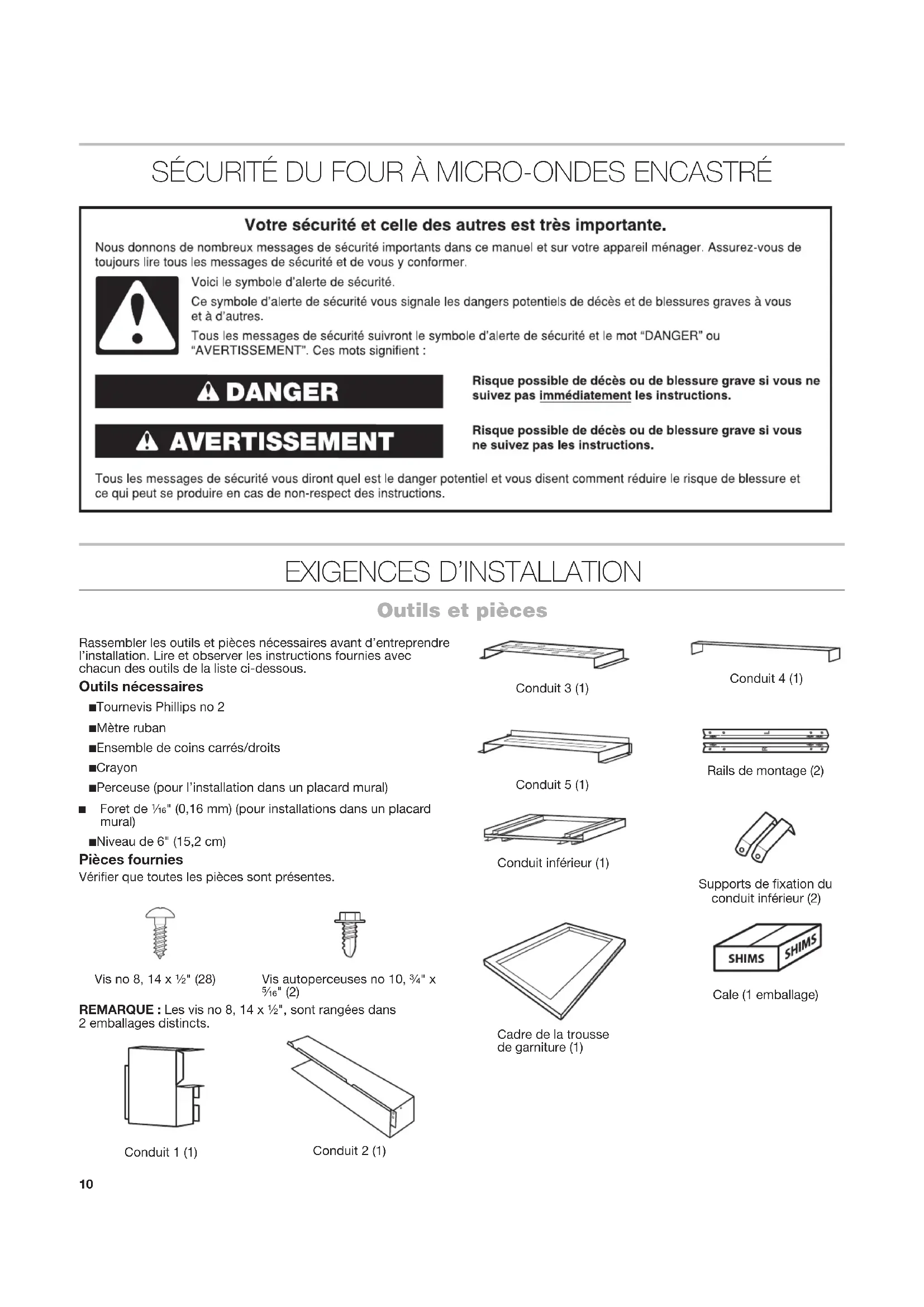 Outils et pièces Rassembler les outils et pièces nécessaires avant d’entreprendre l’installation. Lire et observer les instructions fournies avec chacun des outils de la liste ci-dessous. Outils nécessaires ■ Tournevis Phillips no 2 ■ Mètre ruban ■ Ensemble de coins carrés/droits ■ Crayon ■ Perceuse (pour l’installation dans un placard mural) ■ Foret de Z\zn" (0,16 mm) (pour installations dans un placard mural) ■ Niveau de 6" (15,2 cm) Pièces fournies Vérifier que toutes les pièces sont présentes. Vis no 8, 14 x Z\x" (28) Conduit 1 (1) Conduit 2 (1) Conduit 3 (1) Conduit 4 (1) Conduit 5 (1) Rails de montage (2) Cadre de la trousse de garniture (1) Cale (1 emballage) Vis autoperceuses no 10, C\v" x B\zn" (2) Supports de fixation du conduit inférieur (2) Conduit inférieur (1) REMARQUE : Les vis no 8, 14 x Z\x", sont rangées dans 2 emballages distincts.11 Le four à micro-ondes peut être installé dans un placard et au-dessus d’un four encastré ou d’un tiroir-réchaud. Inspecter l’ouverture où le four à micro-ondes sera installé. La surface inférieure de l’ouverture doit être d’un minimum de 36" (91,4 cm) au-dessus du plancher. Il doit comporter les caractéristiques suivantes : ■ Placards de bois. ■ Ouverture découpée qui est d’aplomb et d’équerre. Voir le point “Dimensions de l’ouverture à découper” dans la section “Dimensions minimales”. ■ Plancher au niveau de l’encastrement robuste, d’aplomb et en affleurement avec le bas de l’ouverture découpée du placard. ■ Capable de soutenir une charge d’au moins 150 lb (68 kg), ce qui comprend le four à micro-ondes, ainsi que les éléments placés à l’intérieur. ■ Prise de courant reliée à la terre. Voir la section “Spécifications électriques”. ■ Distances de dégagement minimales pour l’emplacement d’installation. Voir la section “Dimensions minimales”. ■ Enceinte complète autour de la partie encastrée du four à micro-ondes, incluant un plafond complet et solide. ■ Plancher de niveau, de l’avant à l’arrière et de gauche à droite. Dimensions minimales Distances de dégagement minimales pour l’installation Pour une installation correcte, les distances de dégagement minimales suivantes doivent être respectées au-dessus et au-dessous de l’ouverture à découper. Installation au-dessus d’un placard/tiroir de remisage Installation au-dessus du four/tiroir de remisage 1"(25 mm)1Z\x"(38 mm)1"(25 mm)3"(76 mm)