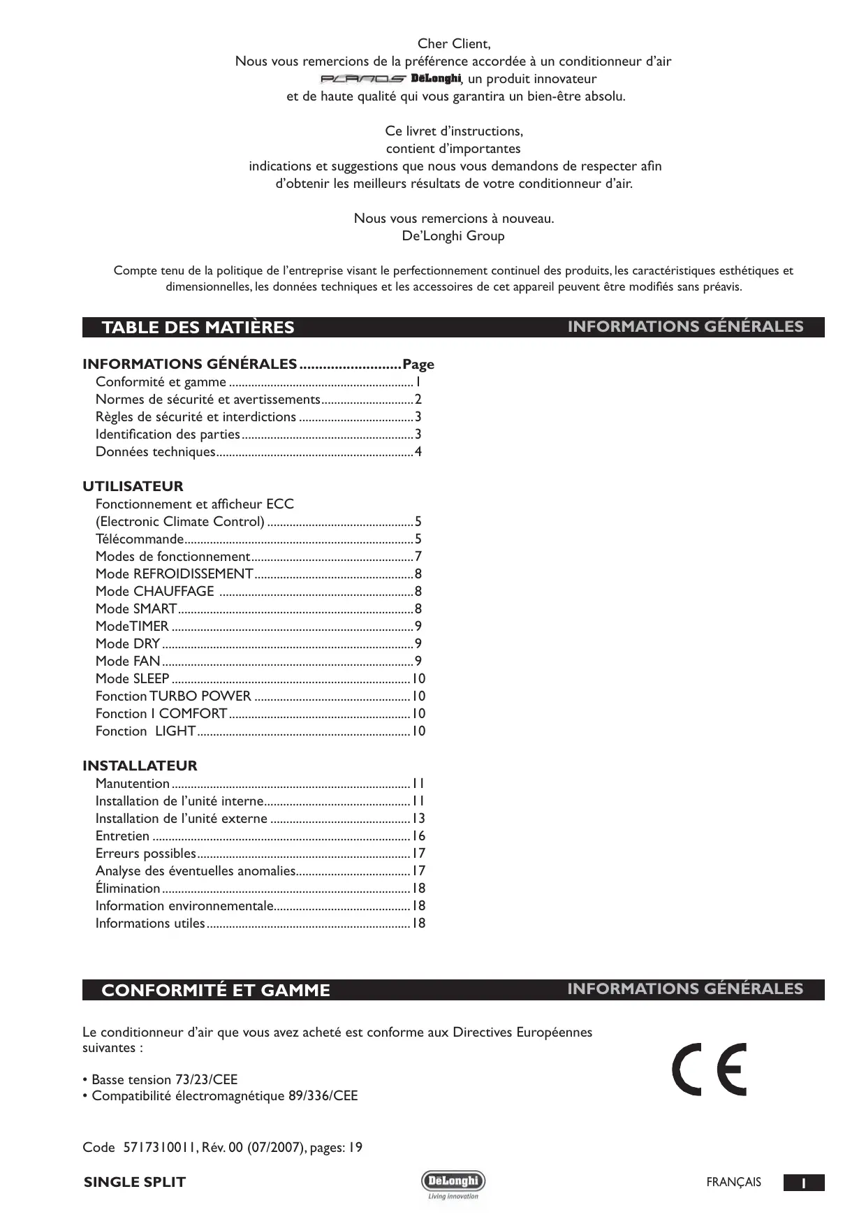 ENGLISH SINGLE SPLIT Cher Client, Nous vous remercions de la préférence accordée à un conditionneur d’air , un produit innovateur et de haute qualité qui vous garantira un bien-être absolu. Ce livret d’instructions, contient d’importantes indications et suggestions que nous vous demandons de respecter afin d’obtenir les meilleurs résultats de votre conditionneur d’air. Nous vous remercions à nouveau. De’Longhi Group Compte tenu de la politique de l’entreprise visant le perfectionnement continuel des produits, les caractéristiques esthétiques et dimensionnelles, les données techniques et les accessoires de cet appareil peuvent être modifiés sans préavis.
