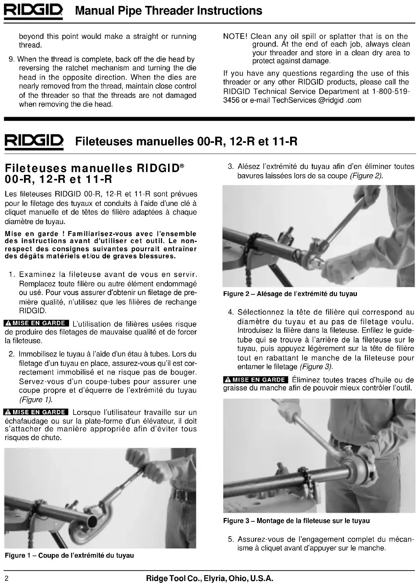 filetage d’un tuyau en place, assurez-vous qu’il est cor- rectement immobilisé et ne risque pas de bouger. Servez-vous d’un coupe-tubes pour assurer une coupe propre et d’équerre de l’extrémité du tuyau (Figure 1). Lorsque l’utilisateur travaille sur un échafaudage ou sur la plate-forme d’un élévateur, il doit s’attacher de manière appropriée afin d’éviter tous risques de chute. Figure 1 – Coupe de l’extrémité du tuyauMISE EN GARDEMISE EN GARDEMISE EN GARDE NOTE! Clean any oil spill or splatter that is on the ground. At the end of each job, always clean your threader and store in a clean dry area to protect against damage. If you have any questions regarding the use of this threader or any other RIDGID products, please call the RIDGID Technical Service Department at 1-800-519- 3456 or e-mail TechServices @ridgid .com Fileteuses manuelles 00-R, 12-R et 11-R3
