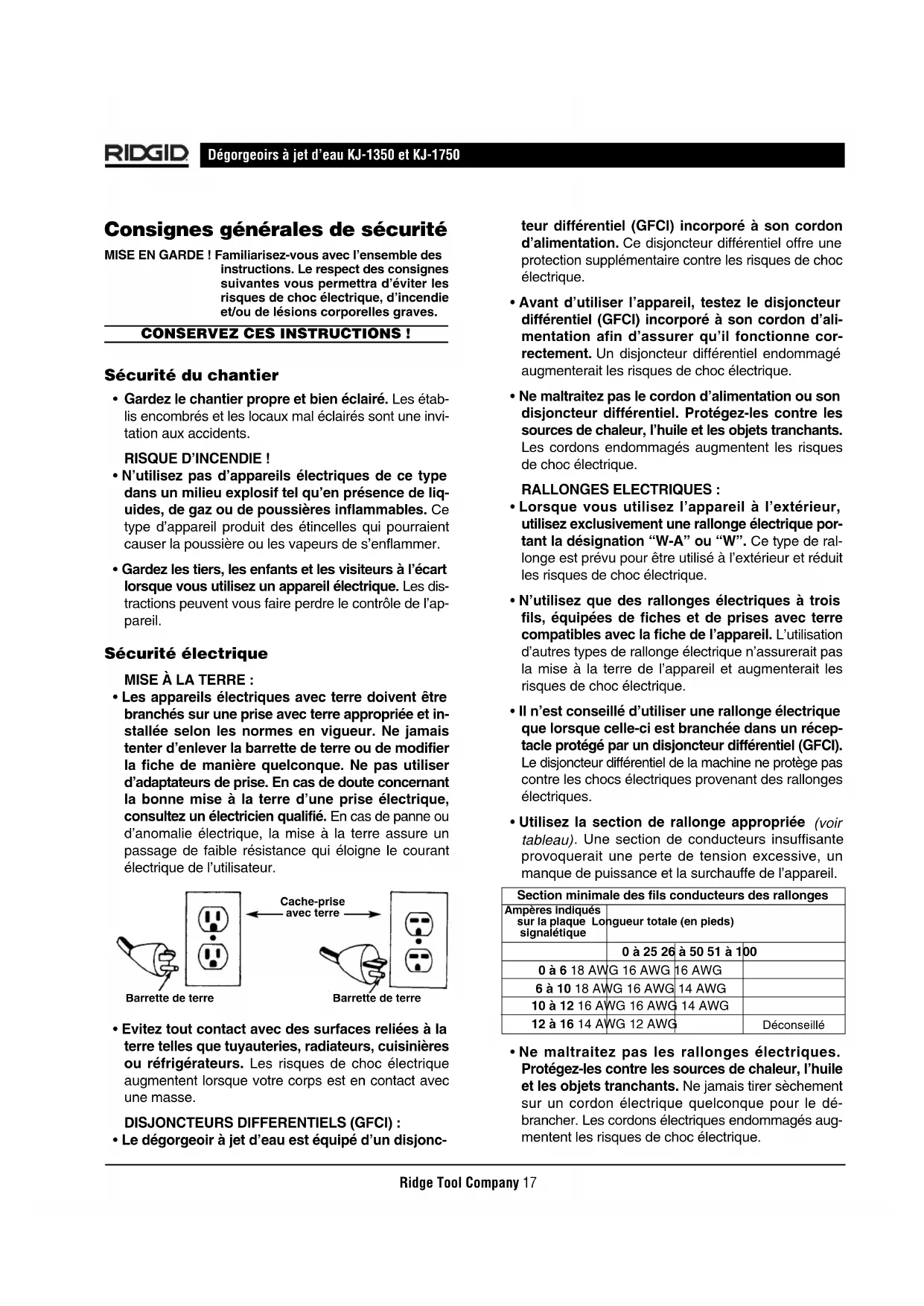 - Ne maltraitez pas les rallonges électriques. Protégez-les contre les sources de chaleur, l’huile et les objets tranchants. Ne jamais tirer sèchement sur un cordon électrique quelconque pour le dé- brancher. Les cordons électriques endommagés aug- mentent les risques de choc électrique. Section minimale des fils conducteurs des rallonges Ampères indiquéssur la plaque Longueur totale (en pieds)signalétique 0 à 25 26 à 50 51 à 100 0 à 6 18 AWG 16 AWG 16 AWG 6 à 10 18 AWG 16 AWG 14 AWG 10 à 12 16 AWG 16 AWG 14 AWG 12 à 16 14 AWG 12 AWG DéconseilléBarrette de terreCache-priseavec terreBarrette de terreRidge Tool Company18 Dégorgeoirs à jet d’eau KJ-1350 et KJ-1750