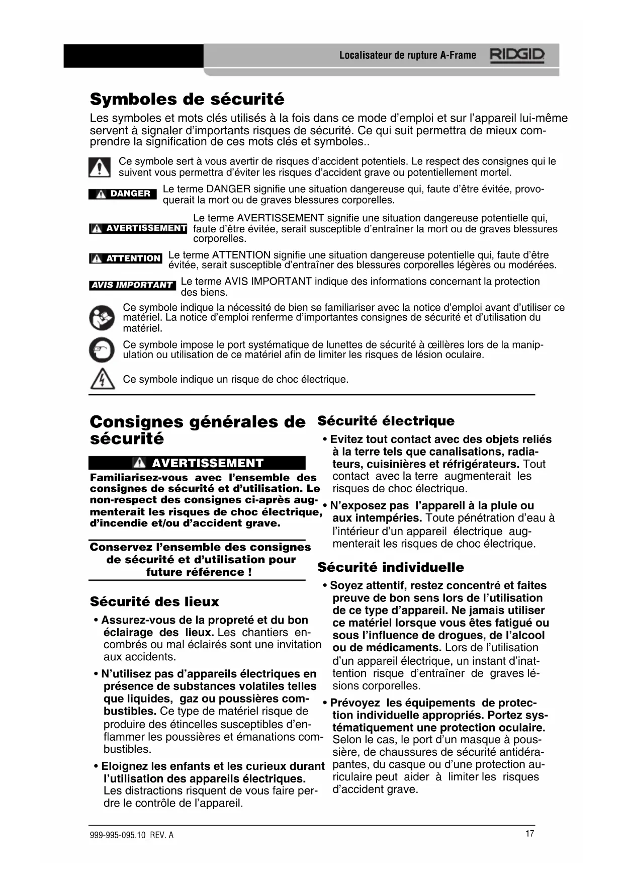 - Avant d’utiliser le localisateur de rupture RIDGID A-Frame, familiarisez-vous avec le mode d’emploi ci-présent et ceux de tout autre matériel utilisé. Le non-respect de l’ensemble des consignes et avertissement qu’ils renferment pourrait occasionner des dégâts matériels et/ou de graves blessures corporelles.
