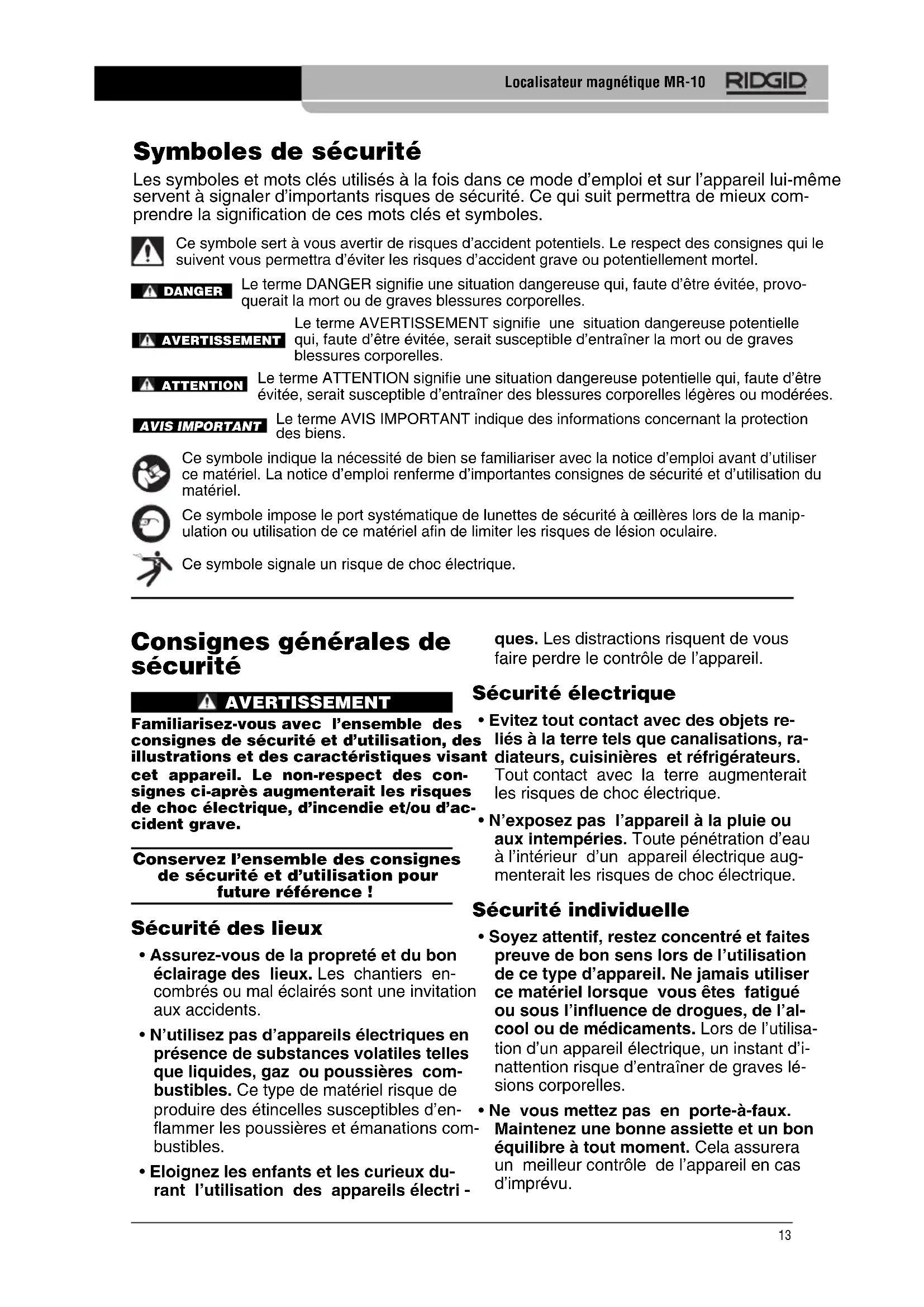 - Confiez la révision de tout appareil électrique à un réparateur qualifié se servant exclusivement de pièces de rechange identiques aux pièces d’o- rigine. Cela assurera la sécurité opéra- tionnelle de l’appareil. Consignes de sécurité spécifiques AVERTISSEMENT La section suivante contient d’impor-tantes consignes de sécurité visant celocalisateur en particulier.Afin de limiter les risques de choc élec-trique ou autre accident grave, famil-iarisez-vous avec les consignes suiv-antes avant d’utiliser le localisateur mag-nétique RIDGID MR-10. CONSERVEZ CES CONSIGNES ! Gardez ce mode d’emploi avec l’appareil afin qu’il soit à portée de main de tout utilisa- teur éventuel. Sécurité du localisateur magnétique MR-10