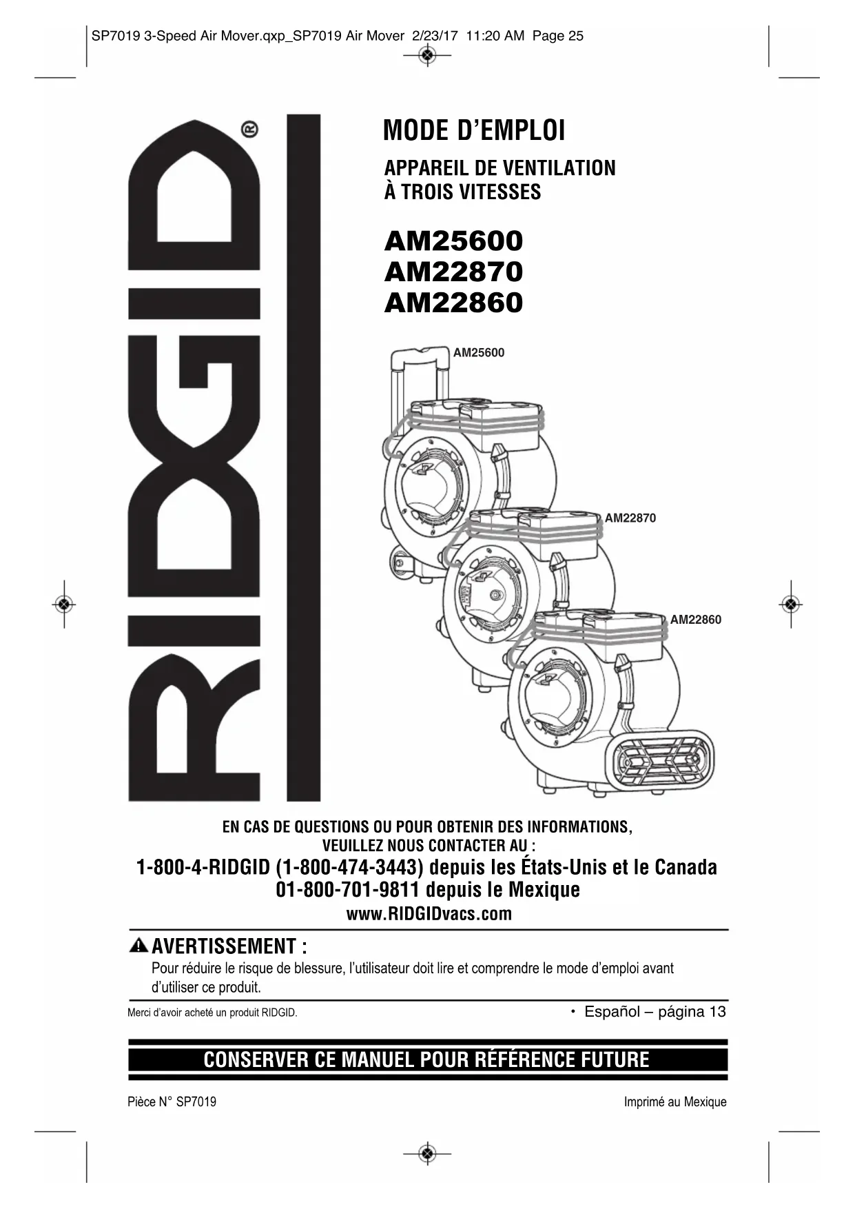 Légende N° depièceDescription1 510141 Commutateur et bouton2 833658 Grille, prise d’air AM2560 et AM22863 510551 Grille, admission (avec prises decourant confort et matériel defixation), AM22874 833690 Pieds tampons (paquet de 4)5 833675 Cordon avec ficheLégende N° depièceDescription6 841368 Cordon avec fiche, AM22877 833674 Moteur8 833659 Grille de sortie d’air9 833660 Roue de soufflante10 510140 Ensemble de roue, AM256011 833691 Poignée de tirage, AM256012 SP7019 Mode d’emploiSP7019 3-Speed Air Mover.qxp_SP7019 Air Mover 2/23/17 11:20 AM Page 35Pièce N° SP7019 Imprimé N° SP7019 Imprimé au Mexique 02/17 c 2017 Emerson www.RIDGID.com Ce qui est couvert par la garantieLes outils RIDGID sont garantis sans défauts de matériau ou de façon.Durée de la garantieCette garantie est valable pendant toute la durée de vie de l’outil RIDGID . Le produit n’est plus couvert lorsqu’il cessed’être utilisable pour des causes autres que des défauts de matériau ou de façon.Le service après-ventePour tirer parti de cette garantie, le produit complet doit être renvoyé en port payé à RIDGE TOOL COMPANY, Elyria,Ohio ou bien à un quelconque CENTRE DE SERVICE APRÈS-VENTE RIDGID AGRÉÉ. Les clés à tube et autres outilsà main devront être renvoyés au point de vente où ils ont été achetés.Les mesures de rectification des problèmesLes produits garantis seront réparés ou remplacés gratuitement selon le choix de RIDGE TOOL et ils seront renvoyés au client en port payé; ou, si le produit est toujours défectueux à la suite de trois tentatives de réparation ou de remplacement au cours de la période de garantie, vous êtes en droit de recevoir un remboursement complet du prixd’achat de votre outil.Ce qui n’est pas couvert par la garantieLes défaillances causées par une utilisation abusive ou non conforme aux instructions, ou par l’usure ordinaire, ne sontpas couvertes par cette garantie. RIDGE TOOL n’est responsable d’aucun dommage secondaire ou indirect.Effet des lois locales sur cette garantieAu Canada, certaines provinces ne permettent peut-être pas l’exclusion ou la limitation des dommages secondaires ou indirects; par conséquent, il est possible que l’exclusion ou la limitation susmentionnée ne s’applique pas à vous. Cette garantie vous confère des droits contractuels spécifiques, et vous disposez peut-être d’autres droits qui peuvent varierd’une province à l’autre.Aucune autre garantie expresse ne s’appliqueLa présente GARANTIE À VIE COMPLÈTE est la garantie unique et exclusive concernant les produits RIDGID . Aucun salarié, agent, distributeur ou autre n’est autorisé à modifier cette garantie ou à offrir une quelconque autre garantie de la part de RIDGE TOOL COMPANY. Stock N° AM2286, AM2287, AM2560 Modèle N° AM22860, AM22870, AM25600 Le numéro de modèle et le numéro de série sont inscrits à l’arrière de l’appareil. Il est recommandé d’inscrire ces deux numéros en lieu sûr pour référence future. Symbole de qualité, de durabilité et de fiabilité EN CAS DE QUESTIONS OU POUR OBTENIR DES INFORMATIONS, VEUILLEZ NOUS CONTACTER AU : 1-800-4-RIDGID (1-800-474-3443) depuis les États-Unis et le Canada 01-800-701-9811 depuis le Mexique www.RIDGIDvacs.com Prière d’avoir votre numéro de modèle ainsi que votre numéro de série à portée de la main avant de nous appeler.SP7019 3-Speed Air Mover.qxp_SP7019 Air Mover 2/23/17 11:20 AM Page 36