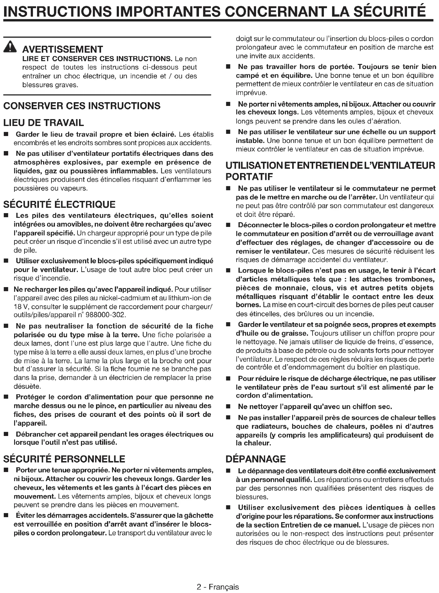PORTATIF Ne pas utiliser le ventilateur si le commutateur ne permet pas de le mettre en marche ou de l’arrêter. Un ventilateur qui ne peut pas être contrôlé par son commutateur est dangereux et doit être réparé. Déconnecter le blocs-piles o cordon prolongateur et mettre le commutateur en position d’arrêt ou de verrouillage avant d’effectuer des réglages, de changer d’accessoire ou de remiser le ventilateur. Ces mesures de sécurité réduisent les risques de démarrage accidentel du ventilateur. Lorsque le blocs-piles n’est pas en usage, le tenir à l’écart d’articles métalliques tels que : les attaches trombones, pièces de monnaie, clous, vis et autres petits objets métalliques risquant d’établir le contact entre les deux bornes. La mise en court-circuit des bornes de piles peut causer des étincelles, des brûlures ou un incendie. Garder le ventilateur et sa poignée secs, propres et exempts d’huile ou de graisse. Toujours utiliser un chiffon propre pour le nettoyage. Ne jamais utiliser de liquide de freins, d’essence, de produits à base de pétrole ou de solvants forts pour nettoyer l’ventilateur. Le respect de ces règles réduira les risques de perte de contrôle et d’endommagement du boîtier en plastique. Pour réduire le risque de décharge électrique, ne pas utiliser le ventilateur près de l’eau surtout s’il est alimenté par le cordon d’alimentation. Ne nettoyer l’appareil qu’avec un chiffon sec. Ne pas installer l’appareil près de sources de chaleur telles que radiateurs, bouches de chaleurs, poêles ni d’autres appareils (y compris les amplificateurs) qui produisent de la chaleur. DÉPANNAGE Le dépannage des ventilateurs doit être confié exclusivement à un personnel qualifié. Les réparations ou entretiens effectués par des personnes non qualifiées présentent des risques de blessures. Utiliser exclusivement des pièces identiques à celles d’origine pour les réparations. Se conformer aux instructions de la section Entretien de ce manuel. L’usage de pièces non autorisées ou le non-respect des instructions peut présenter des risques de choc électrique ou de blessures.3 - Français