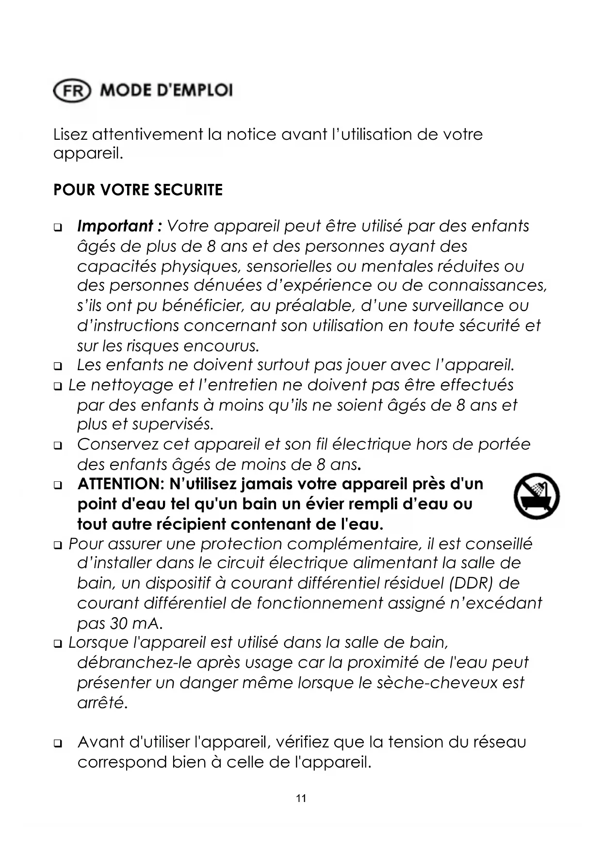 Important : Votre appareil peut être utilisé par des enfants âgés de plus de 8 ans et des personnes ayant des capacités physiques, sensorielles ou mentales réduites ou des personnes dénuées d’expérience ou de connaissances, s’ils ont pu bénéficier, au préalable, d’une surveillance ou d’instructions concernant son utilisation en toute sécurité et sur les risques encourus. Les enfants ne doivent surtout pas jouer avec l’appareil. Le nettoyage et l’entretien ne doivent pas être effectués par des enfants à moins qu’ils ne soient âgés de 8 ans et plus et supervisés. Conservez cet appareil et son fil électrique hors de portée des enfants âgés de moins de 8 ans. ATTENTION: N’utilisez jamais votre appareil près d'un point d'eau tel qu'un bain un évier rempli d’eau ou tout autre récipient contenant de l'eau. Pour assurer une protection complémentaire, il est conseillé d’installer dans le circuit électrique alimentant la salle de bain, un dispositif à courant différentiel résiduel (DDR) de courant différentiel de fonctionnement assigné n’excédant pas 30 mA. Lorsque l'appareil est utilisé dans la salle de bain, débranchez-le après usage car la proximité de l'eau peut présenter un danger même lorsque le sèche-cheveux est arrêté. Avant d'utiliser l'appareil, vérifiez que la tension du réseau correspond bien à celle de l'appareil.