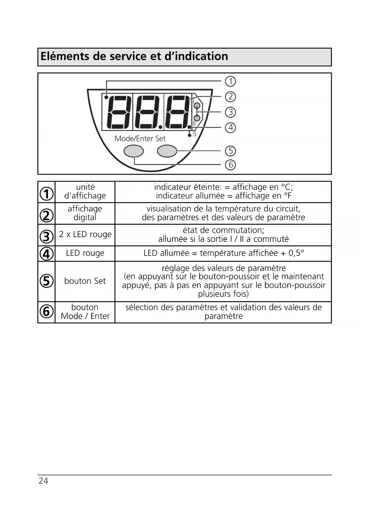 | 4 | LED rouge | LED allumée = température affichée + 0,5° |