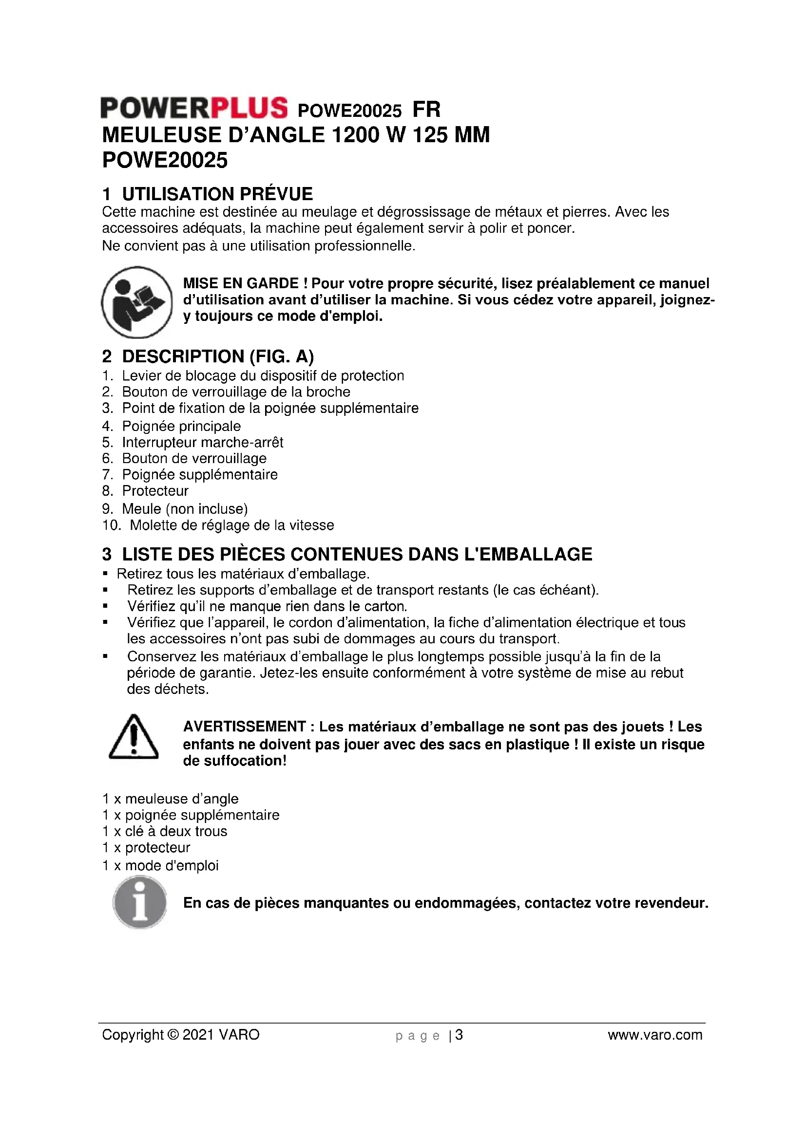 enfants ne doivent pas jouer avec des sacs en plastique ! Il existe un risque de suffocation! 1 x meuleuse d’angle 1 x poignée supplémentaire 1 x clé à deux trous 1 x protecteur 1 x mode d'emploi En cas de pièces manquantes ou endommagées, contactez votre revendeur.POWE20025 FR Copyright © 2021 VARO p a g e | 4 www.varo.com 4 PICTOGRAMMES Les symboles suivants sont utilisés dans ce mode d’emploi et/ou sur la machine :