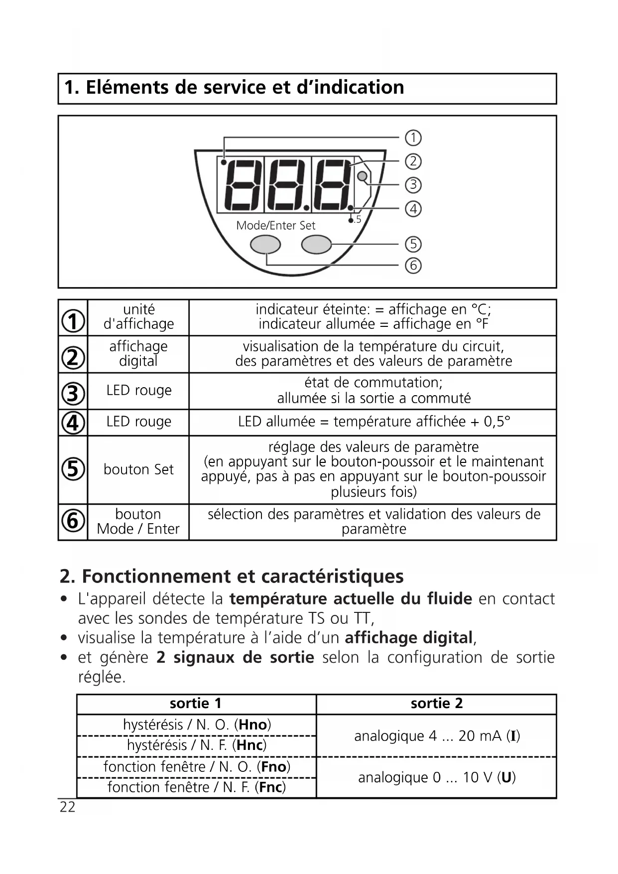 affichage digital visualisation de la température du circuit, des paramètres et des valeurs de paramètre unité d'affichage indicateur éteinte: = affichage en °C; indicateur allumée = affichage en °F LED rouge état de commutation; allumée si la sortie a commuté LED rouge LED allumée = température affichée + 0,5° bouton Mode / Enter sélection des paramètres et validation des valeurs de paramètre bouton Set réglage des valeurs de paramètre (en appuyant sur le bouton-poussoir et le maintenant appuyé, pas à pas en appuyant sur le bouton-poussoir plusieurs fois)