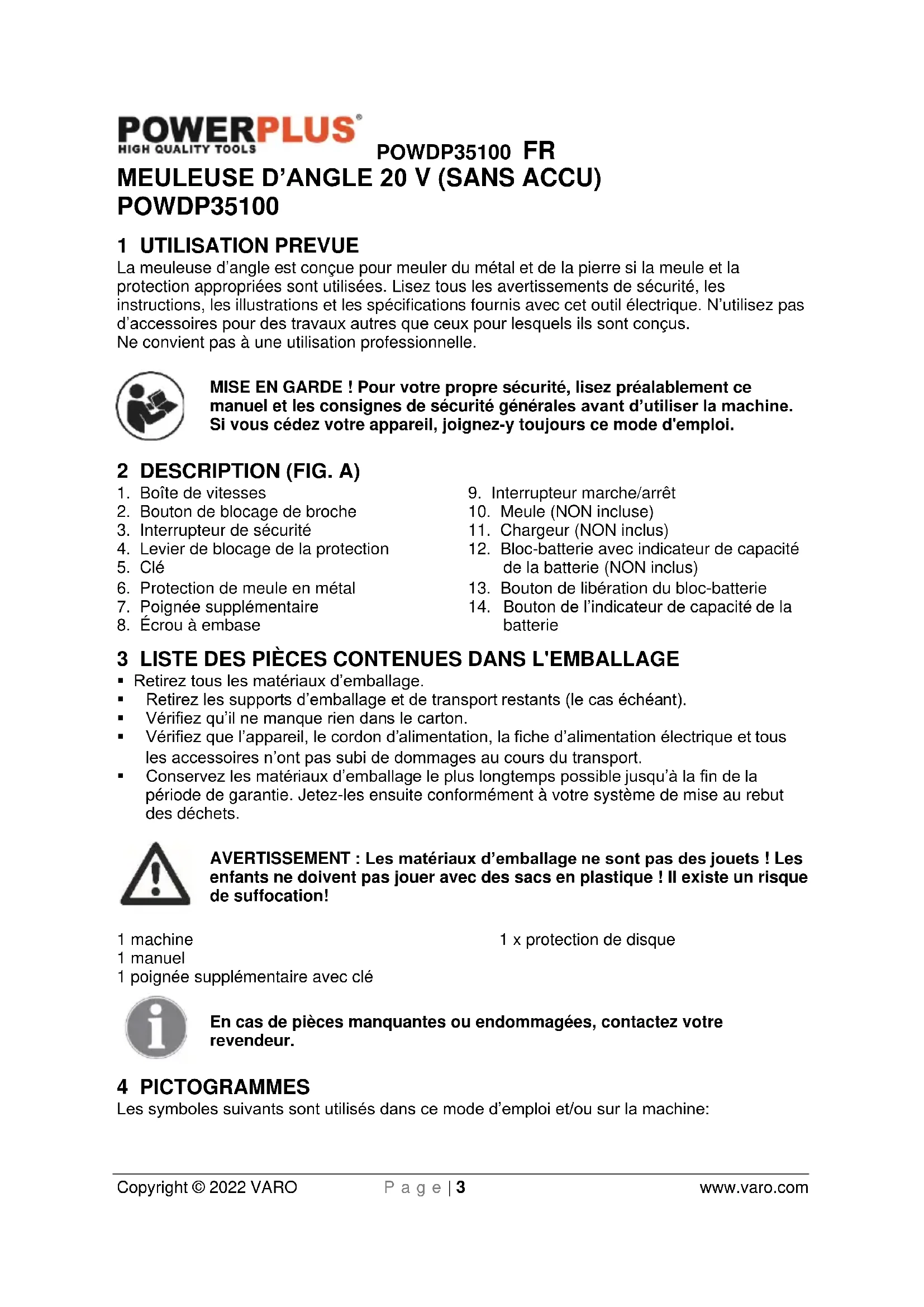 1 UTILISATION PREVUE 3 2 DESCRIPTION (FIG. A) 3 3 LIST DES PIECES CONTENUES DANS L'EMBALLAGE... 4 PICTOGRAMMES 3 5 CONSIGNES DE SECURITE GENÉRALES 4 5.1 Lieu de travail 4 5.2 Sécurité électrique 4 5.3 Sécurité des personnes 5 5.4 Précautions de manipulation et d'utilisation d'outils electriques 5 5.5 Utilisation et entretien d'un outil sur batterie 6 5.6 Entretien 6 6 CONSIGNES DE SECURITE POUR MEULEUSES D'ANGLE.....6 7 CONSIGNES DE SECURITE SUPPLEMENTaires POUR LES BATTERIES ET LES CHARGEURS 7.1 Batteries 7 7.2 Chargeurs 8 8 CHARGE ET INSERTION OU RETRAIT DE LA BATTERIE.....8 8.1 Indications du chargeur (Fig. 1). 8 8.2 Retrait/insertion de la batterie (Fig. 2) 8 8.3 Indicateur de capacité de la batterie (Fig. 3) 9 9 ASSEMBLAGE 9 9.1 Remplacement du disque de meulage (Fig. 4) 9.2 Montage du dispositif de protection (Fig. 5) 9.3 Remplacement du disque de meulage (Fig. 6a-7b). 9 10 UTILISATION 10 10.1 Mise sous/hors tension (Fig. 8). 10 10.1.1 Mise en marche 10 10.1.2 Arret 10 11 UTILISATION 11 11.1 Rangement de la clé (Fig. 9) 11