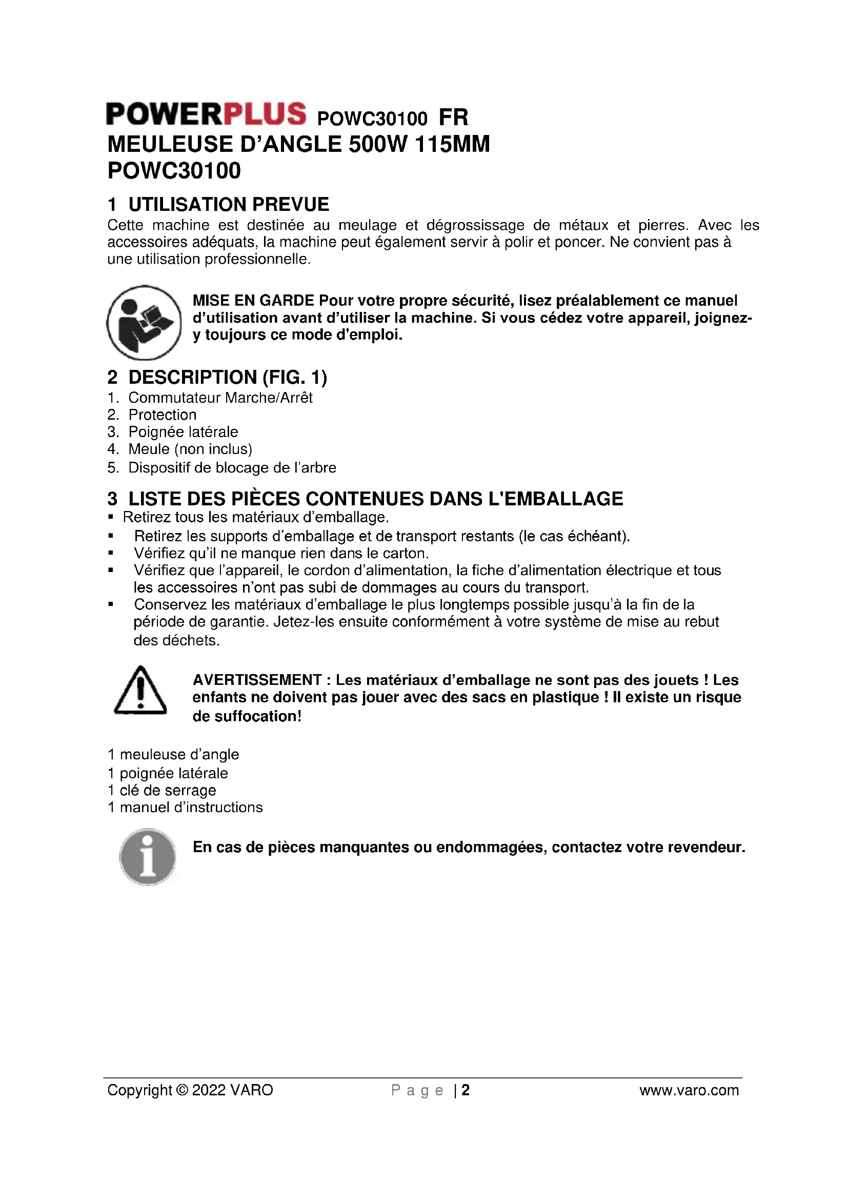 enfants ne doivent pas jouer avec des sacs en plastique ! Il existe un risque de suffocation! 1 meuleuse d’angle 1 poignée latérale 1 clé de serrage 1 manuel d’instructions En cas de pièces manquantes ou endommagées, contactez votre revendeur.POWC30100 FR Copyright © 2022 VARO P a g e | 3 www.varo.com 4 PICTOGRAMMES Les symboles suivants sont utilisés dans ce mode d’emploi et/ou sur la machine :