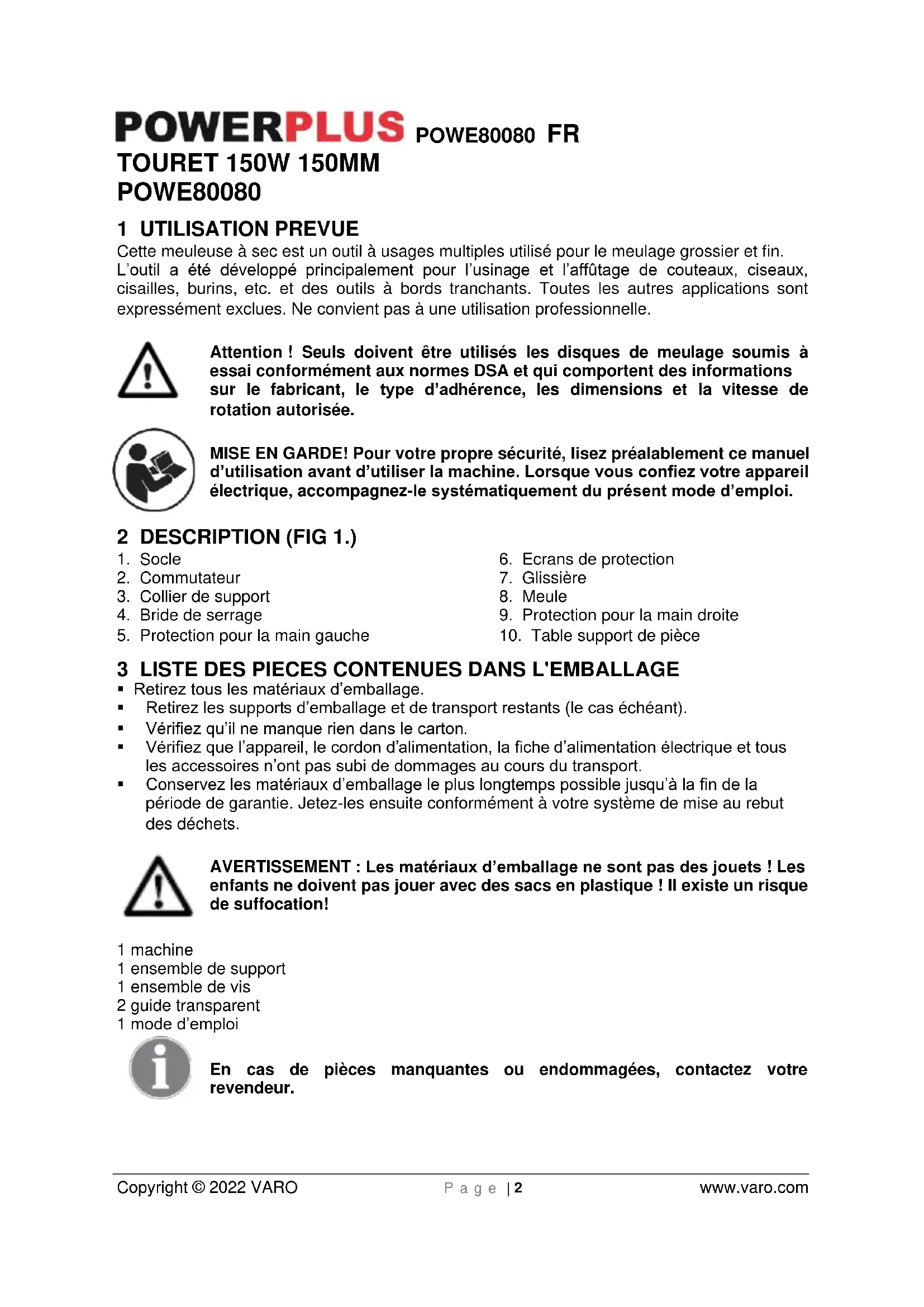 - Cette machine n’est pas adaptée au meulage des matières tendres telles que du plomb, du magnésium ou des alliages légers. 7 MONTAGE MISE EN GARDE! Retirer la fiche de prise de courant avant d'effectuer tout réglage ou entretien.POWE80080 FR Copyright © 2022 VARO P a g e | 6 www.varo.com