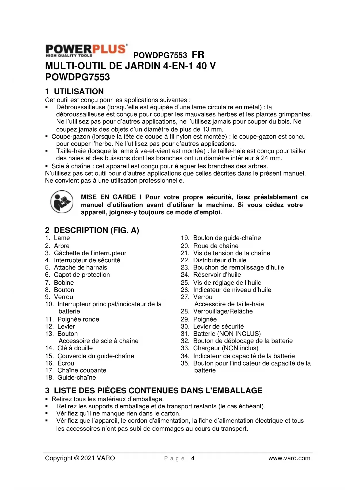 - Évitez tout contact avec des obstacles fixes (roches, murs, palissades, etc.). Le fil s’userait rapidement. Utilisez le bord du capot de protection pour maintenir l’outil à la distance appropriée. Attention ! Ne posez pas la tête de coupe au sol pendant le fonctionnement !POWDPG7553 FR Copyright © 2021 VARO P a g e | 18 www.varo.com