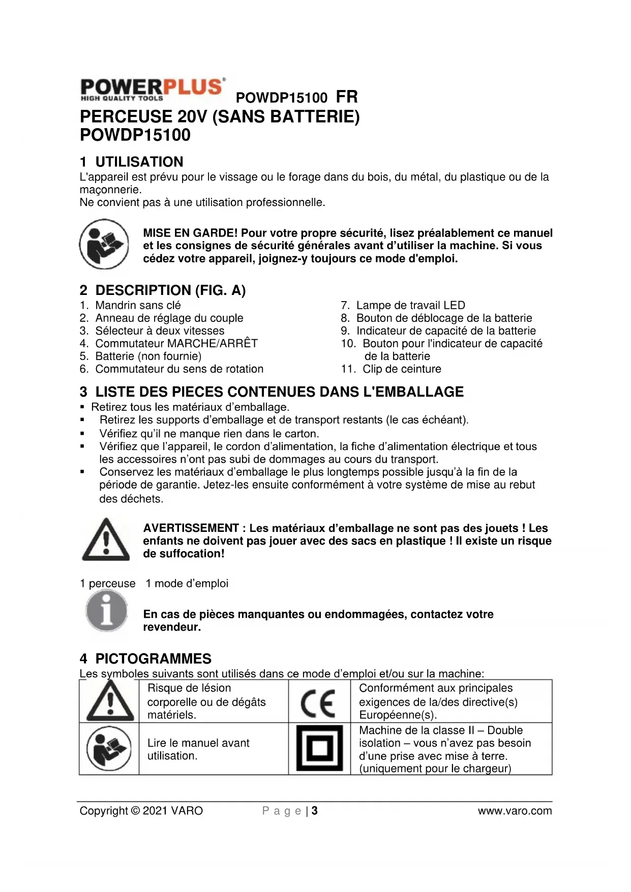VARO – Vic. Van Rompuy N.V. - Joseph Van Instraat 9 - BE2500 Lier - BELGIQUE, déclare que : appareil : Perceuse 20V marque : PowerPlus modèle : POWDP15100 est en conformité avec les exigences essentielles et les autres dispositions pertinentes des Directives européennes applicables, basées sur l'application des normes européennes harmonisées. Toute modification non autorisée de l'appareil annule cette déclaration. Directives européennes (y compris, le cas échéant, leurs amendements à la date de la signature) : 2011/65/EU 2006/42/EC 2014/30/EU Normes européennes harmonisées (y compris, le cas échéant, leurs amendements à la date de la signature) : EN62841-1 : 2015 EN62841-2-1 : 2018 EN55014-1 : 2017 EN55014-2 : 2015 Détenteur de la Documentation technique : Philippe Vankerkhove, VARO – Vic. Van Rompuy N.V. Le soussigné agit au nom du PDG de l'entreprise, Ludo Mertens Réglementation – Directeur de la conformité 24/03/2021, Lier - BelgiumPOWDP15100 EN Copyright © 2021 VARO P a g e | 1 www.varo.com 1 APPLICATION ................................................................................ 3