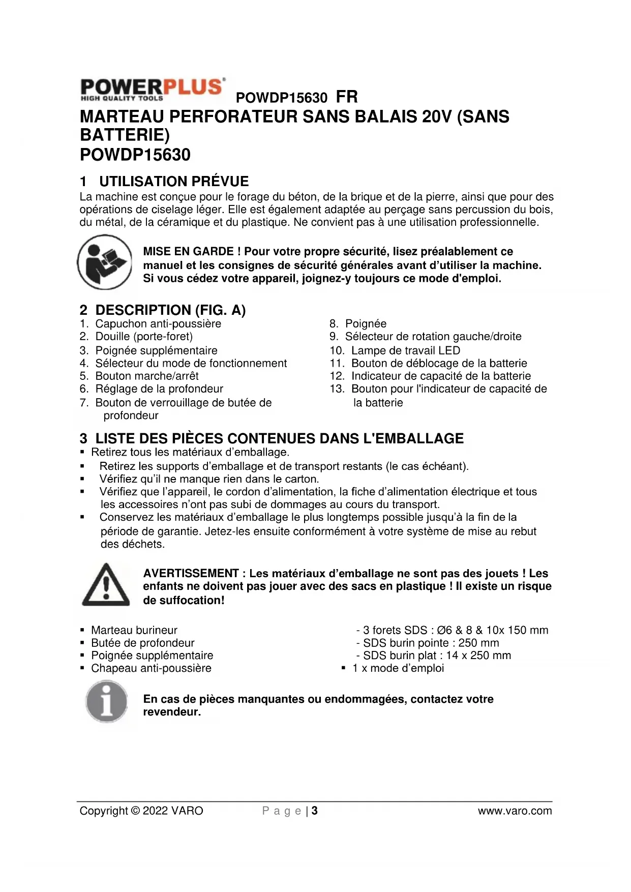 - Contrôlez régulièrement l'usure ou les dommages du porte-outil.POWDP15630 FR Copyright © 2022 VARO P a g e | 7 www.varo.com