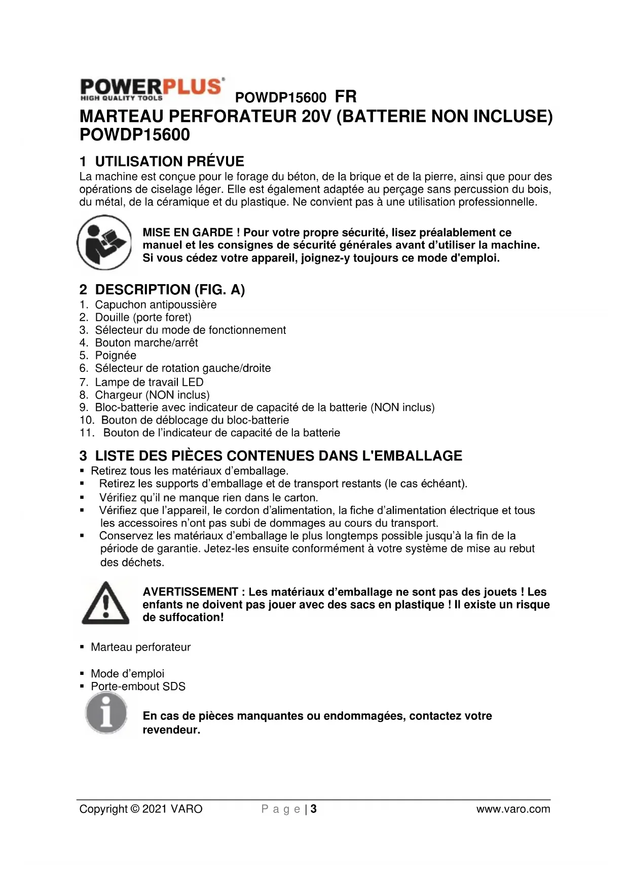 VARO – Vic. Van Rompuy N.V. - Joseph Van Instraat 9 - BE2500 Lier - BELGIQUE, déclare que: appareil : Marteau perforateur 20V (BATTERIE NON INCLUSE) marque : POWERplus modèle : POWDP15600 est en conformité avec les exigences essentielles et les autres dispositions pertinentes des Directives européennes applicables, basées sur l'application des normes européennes harmonisées. Toute modification non autorisée de l'appareil annule cette déclaration. Directives européennes (y compris, le cas échéant, leurs amendements à la date de la signature) : 2011/65/EU 2006/42/EC 2014/30/EU Normes européennes harmonisées (y compris, le cas échéant, leurs amendements à la date de la signature) : EN60745-1 : 2009 EN60745-2-6 : 2010 EN55014-1 : 2017 EN55014-2 : 2015 Détenteur de la Documentation technique : Philippe Vankerkhove, VARO – Vic. Van Rompuy N.V. Le soussigné agit au nom du PDG de l'entreprise, Ludo Mertens Réglementation – Directeur de la conformité 23/08/2021, Lier - BelgiumPOWDP15600 EN Copyright © 2021 VARO P a g e | 1 www.varo.com 1 INTENDED USE .............................................................................. 3