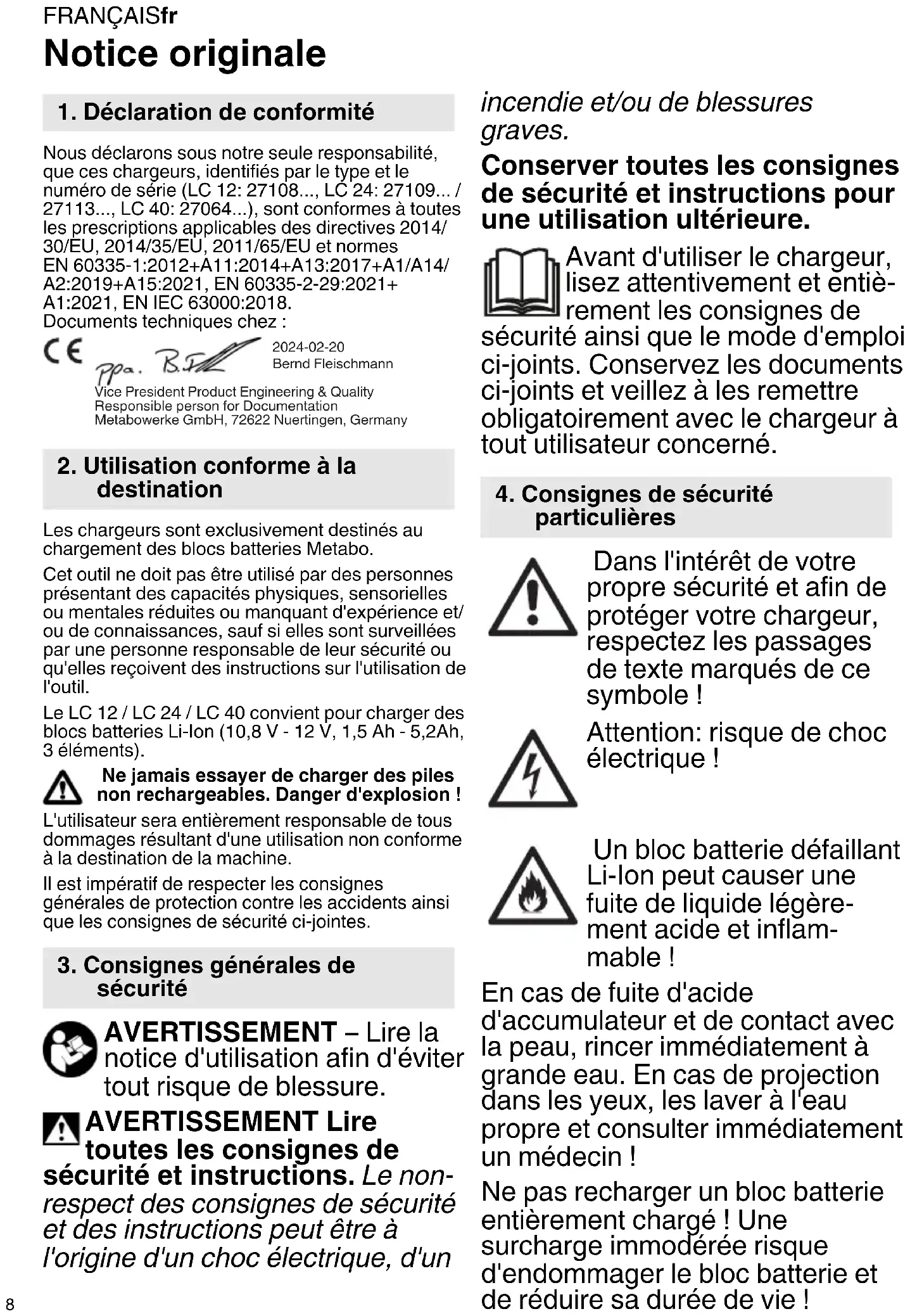 sécurité 2024-02-20 Bernd FleischmannVice President Product Engineering & QualityResponsible person for Documentation Metabowerke GmbH, 72622 Nuertingen, Germany