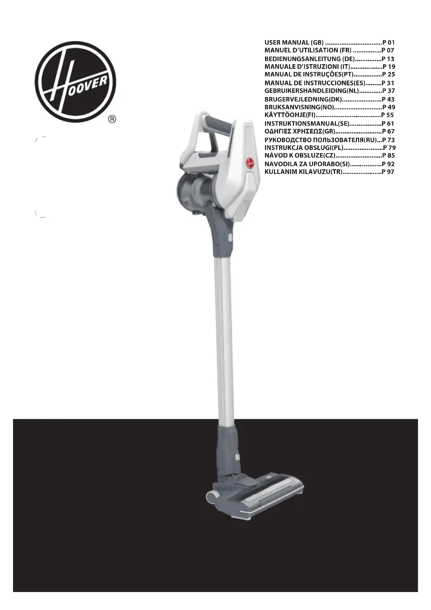 être éliminées avec les ordures ménagères. FR12 DÉPANNAGE Si vous avez des problèmes avec votre nettoyeur, suivez cette simple liste de vérification avant d’appeler le service clientèle Hoover : A. L’aspirateur ne s’allume pas Vérifiez que le nettoyeur est chargé Vérifiez que la batterie est bien en place. B. L’aspirateur s’arrête de fonctionner Vérifiez s’il y a une obstruction dans la brosse, dégagez-la et assurez-vous que le bloc batterie est retiré. Une fois que cela est fait, appuyez simplement sur le bouton marche/arrêt et le produit redémarrera à nouveau. Videz le bac à poussière et lavez le filtre pré-moteur, cyclone unique, détecteur vortex et séparateur cyclonique. Retirez la brosse et le tube pour vérifier s’il y a des blocages dans le conduit. C. Aspiration insuffisante ou pas d’aspiration du tout Videz le bac à poussière et lavez le filtre pré-moteur et le système de cyclone unique. Retirez la brosse et le tube pour vérifier s’il y a des blocages dans le conduit. D. La batterie ne charge pas Contactez le service clientèle Hoover pour effectuer le changement de batterie. Si le problème persiste, contactez le service clientèle Hoover. Cela peut être dû à de très longues périodes de stockage (plus de 6 mois). E. La brosse ne fonctionne pas Contrôlez que le gicleur pour fenêtres est complètement fermé. PIÈCES DÉTACHÉES ET CONSOMMABLES HOOVER Toujours remplacer les pièces par des pièces détachées de la marque Hoover. Celles-ci sont disponibles auprès de votre revendeur Hoover. Lors de la commande de pièces, veuillez toujours préciser le numéro de votre modèle. VOTRE GARANTIE Les conditions de garantie de cet appareil sont définies par notre représentant dans le pays où il est vendu et peuvent être obtenues auprès de votre revendeur. Les détails concernant ces conditions peuvent être obtenus auprès du revendeur auprès duquel l’appareil a été acheté. La facture d’achat ou le reçu doivent être présentés pour toutes réclamations relevant des conditions de cette garantie. IMPORTANT : La batterie de cet aspirateur est garantie 6 mois à compter de la date d’achat. Passés les six mois, le client est responsable du coût d’acquisition d’une nouvelle batterie. Ces conditions peuvent être modifiées sans préavis. FR13