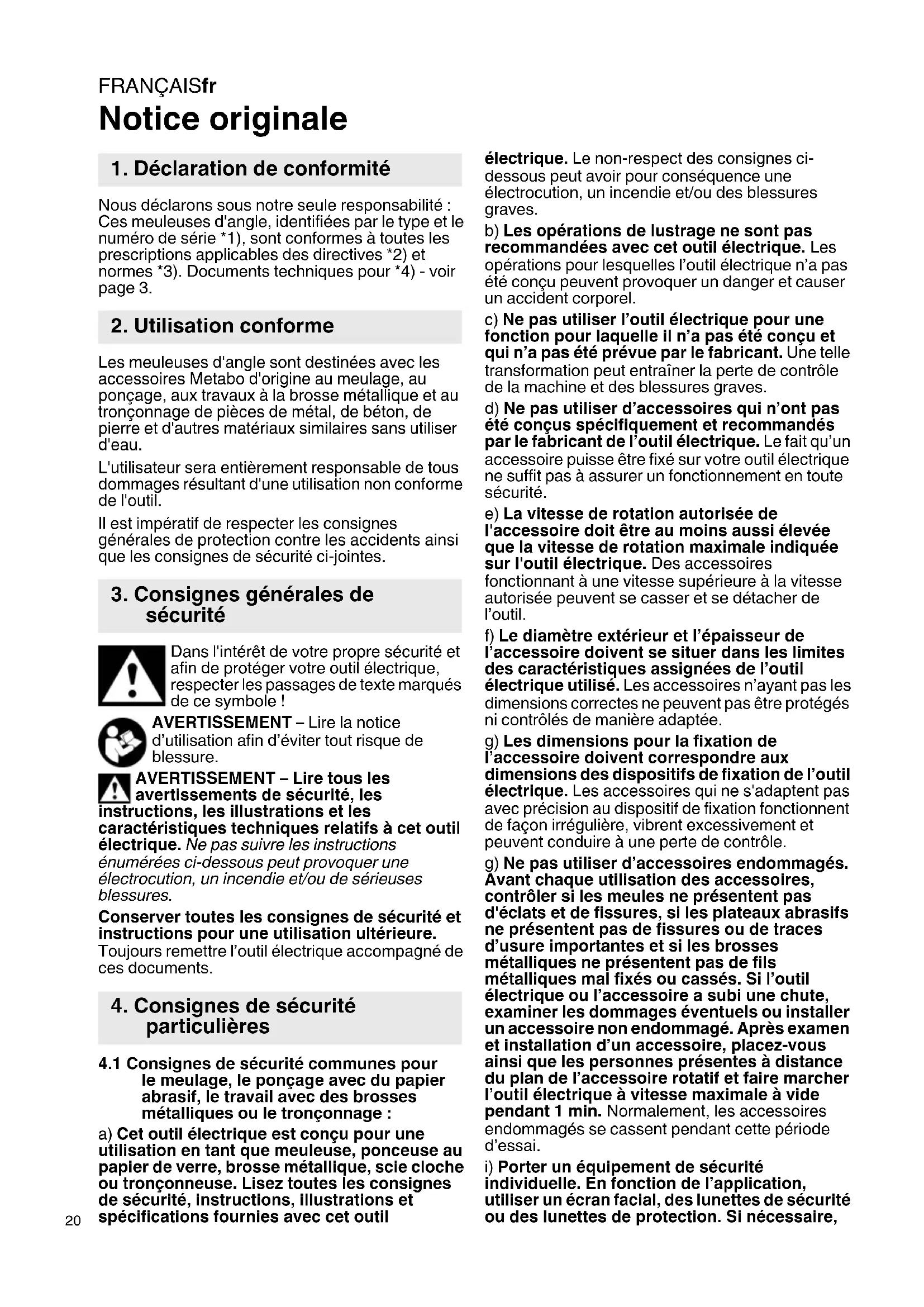 Notice originale Nous déclarons sous notre seule responsabilité : Ces meuleuses d'angle, identifiées par le type et le numéro de série *1), sont conformes à toutes les prescriptions applicables des directives *2) et normes *3). Documents techniques pour *4) - voir page 3. Les meuleuses d'angle sont destinées avec les accessoires Metabo d'origine au meulage, au ponçage, aux travaux à la brosse métallique et au tronçonnage de pièces de métal, de béton, de pierre et d'autres matériaux similaires sans utiliser d'eau. L'utilisateur sera entièrement responsable de tous dommages résultant d'une utilisation non conforme de l'outil. Il est impératif de respecter les consignes générales de protection contre les accidents ainsi que les consignes de sécurité ci-jointes. Dans l'intérêt de votre propre sécurité et afin de protéger votre outil électrique, respecter les passages de texte marqués de ce symbole ! AVERTISSEMENT – Lire la notice d’utilisation afin d’éviter tout risque de blessure. AVERTISSEMENT – Lire tous les avertissements de sécurité, les instructions, les illustrations et les caractéristiques techniques relatifs à cet outil électrique. Ne pas suivre les instructions énumérées ci-dessous peut provoquer une électrocution, un incendie et/ou de sérieuses blessures. Conserver toutes les consignes de sécurité et instructions pour une utilisation ultérieure. Toujours remettre l’outil électrique accompagné de ces documents.