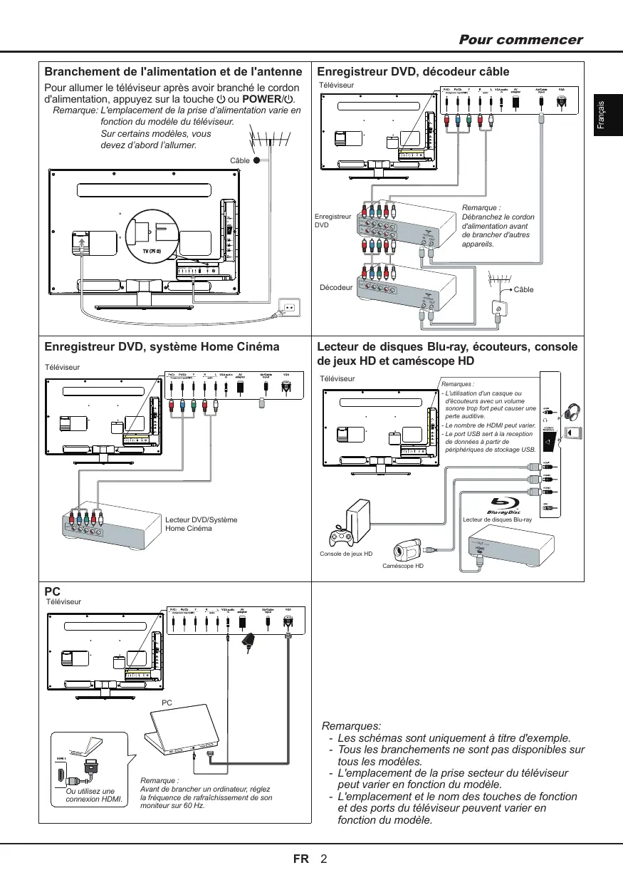 Enregistreur DVD, système Home Cinéma Téléviseur Lecteur de disques Blu-ray, écouteurs, console de jeux HD et caméscope HD Téléviseur OUT OUT Remarques : - L'utilisation d'un casque ou d'écouteurs avec un volume sonore trop fort peut causer une perte auditive. - Le nombre de HDMI peut varier. - Le port USB sert à la reception de données à partir de périphériques de stockage USB. Lecteur DVD/Système Home Cinéma Lecteur de disques Blu-ray OUT Console de jeux HD Caméscope HD