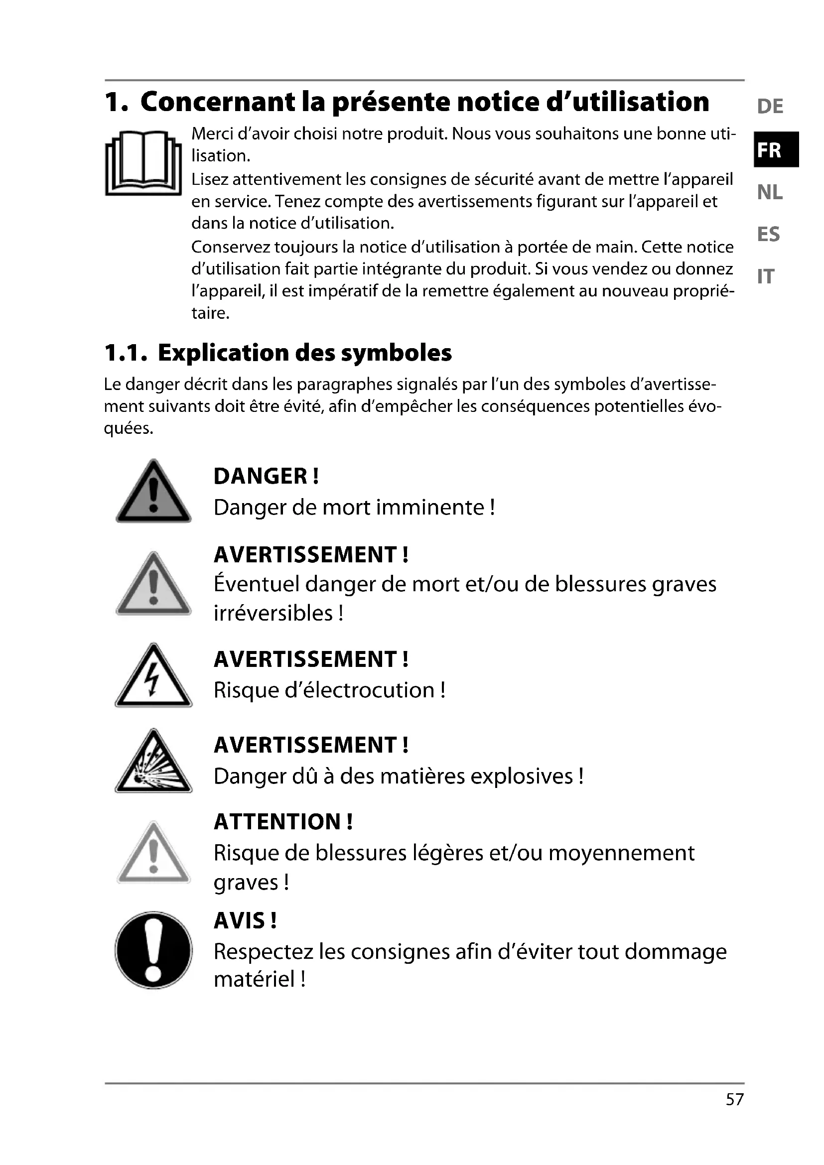 Merci d’avoir choisi notre produit. Nous vous souhaitons une bonne uti- lisation. Lisez attentivement les consignes de sécurité avant de mettre l’appareil en service. Tenez compte des avertissements figurant sur l’appareil et dans la notice d’utilisation. Conservez toujours la notice d’utilisation à portée de main. Cette notice d’utilisation fait partie intégrante du produit. Si vous vendez ou donnez l’appareil, il est impératif de la remettre également au nouveau proprié- taire. 1.1. Explication des symboles Le danger décrit dans les paragraphes signalés par l’un des symboles d’avertisse- ment suivants doit être évité, afin d’empêcher les conséquences potentielles évo- quées. DANGER ! Danger de mort imminente ! AVERTISSEMENT ! Éventuel danger de mort et/ou de blessures graves irréversibles ! AVERTISSEMENT ! Risque d’électrocution ! AVERTISSEMENT ! Danger dû à des matières explosives ! ATTENTION ! Risque de blessures légères et/ou moyennement graves ! AVIS ! Respectez les consignes afin d’éviter tout dommage matériel !58 Informations complémentaires concernant l’utilisation du produit ! AVIS ! Tenez compte des remarques contenues dans la notice d’utilisation !