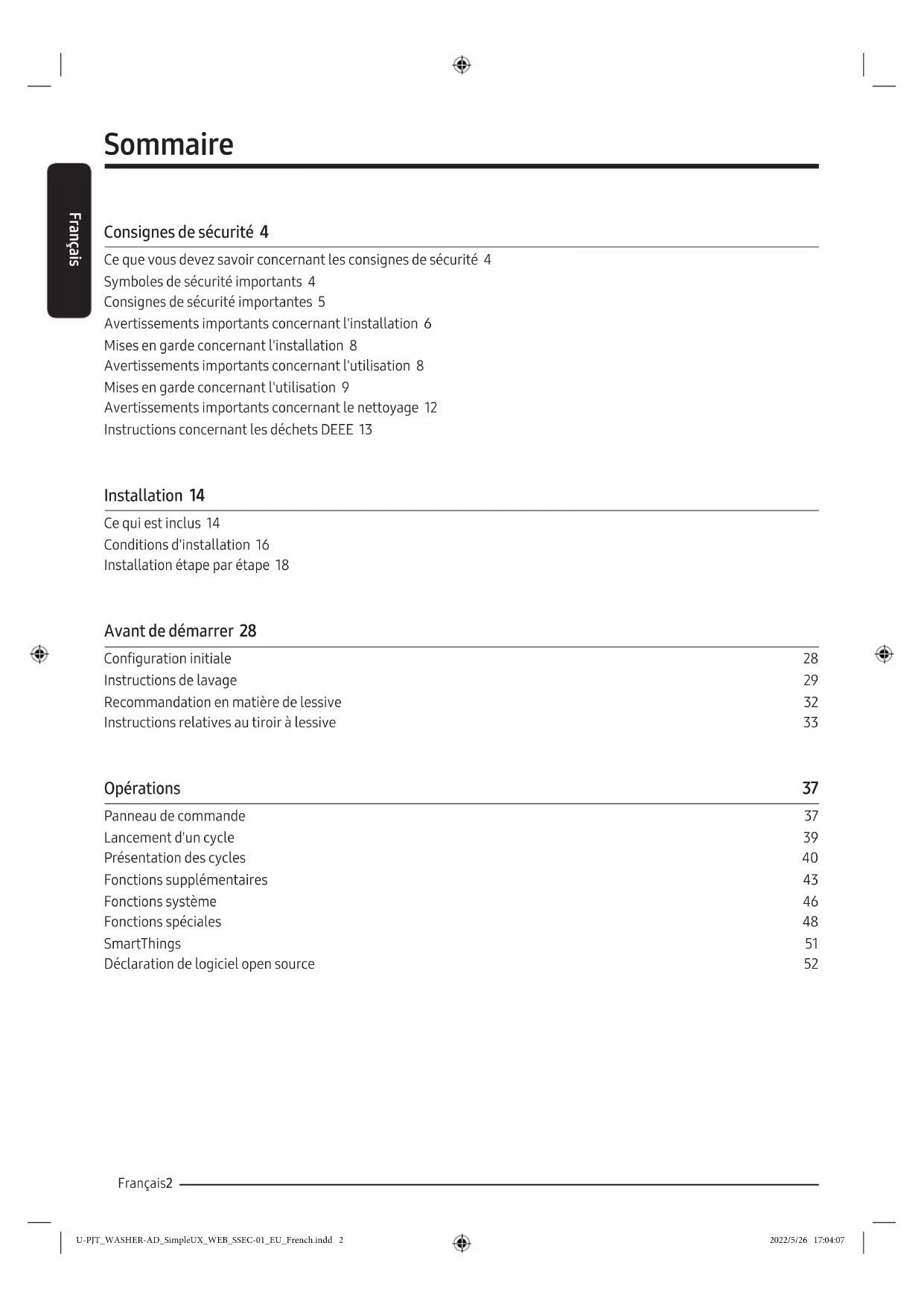 Lave-linge Manuel d'utilisation WW1*T******/WW9*T******/WW8*T******/WW7*T****** U-PJT_WASHER-AD_SimpleUX_WEB_SSEC-01_EU_French.indd 1 2022/5/26 17:04:07Français Français2 Sommaire Consignes de sécurité 4 Ce que vous devez savoir concernant les consignes de sécurité 4 Symboles de sécurité importants 4 Consignes de sécurité importantes 5 Avertissements importants concernant l'installation 6 Mises en garde concernant l'installation 8 Avertissements importants concernant l'utilisation 8 Mises en garde concernant l'utilisation 9 Avertissements importants concernant le nettoyage 12 Instructions concernant les déchets DEEE 13 Installation 14 Ce qui est inclus 14 Conditions d'installation 16 Installation étape par étape 18 Avant de démarrer 28 Configuration initiale 28 Instructions de lavage 29 Recommandation en matière de lessive 32 Instructions relatives au tiroir à lessive 33 Opérations 37 Panneau de commande 37 Lancement d'un cycle 39 Présentation des cycles 40 Fonctions supplémentaires 43 Fonctions système 46 Fonctions spéciales 48 SmartThings 51 Déclaration de logiciel open source 52 U-PJT_WASHER-AD_SimpleUX_WEB_SSEC-01_EU_French.indd 2 2022/5/26 17:04:07Français Français 3 Maintenance 53 Nettoyage tambour+ 53 Vidange d'urgence 54 Nettoyage 55 Dégel de votre lave-linge 60 Mesures en cas de non-utilisation prolongée 60 Dépannage 61 Contrôles 61 Codes d'information 66 Caractéristiques techniques 69 Tableau des symboles d'entretien des tissus 69 Protection de l'environnement 70 Garantie pour les pièces détachées 71 Fiche de caractéristiques techniques 71 Coordonnées de contact 79