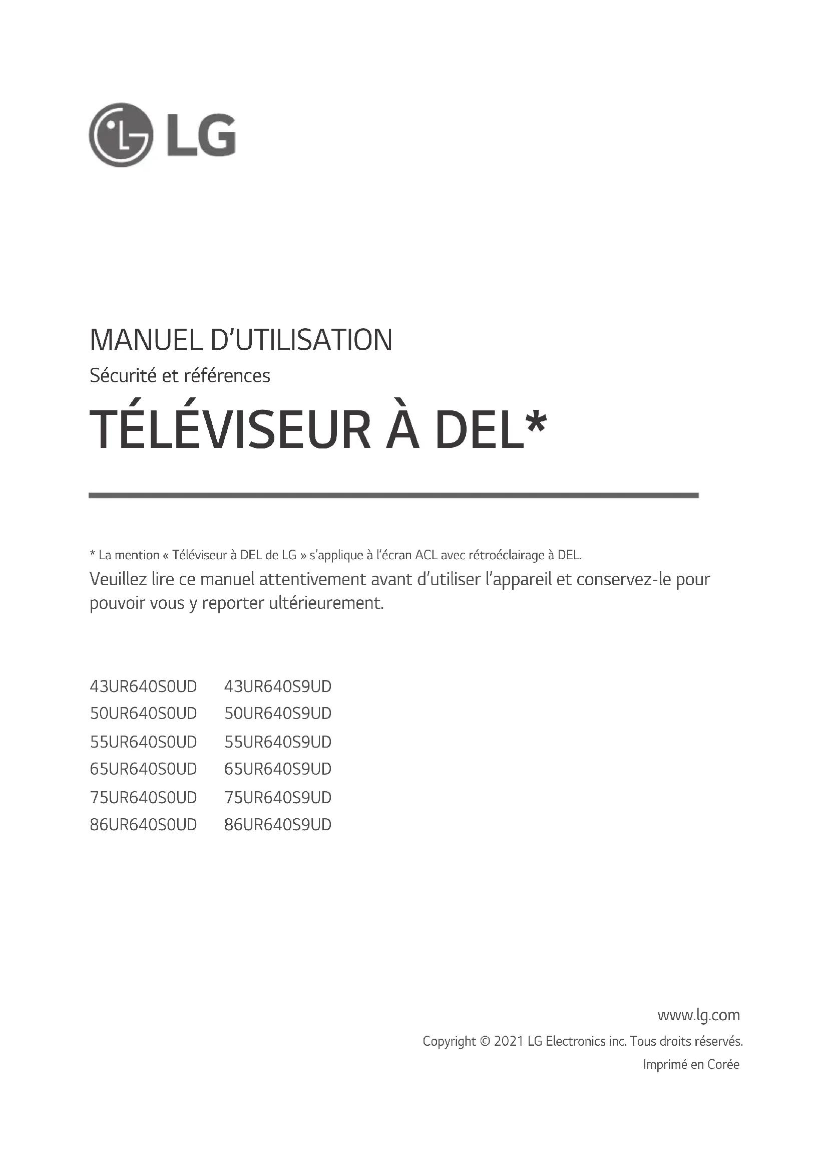 43UR640S0UD 50UR640S0UD 55UR640S0UD 65UR640S0UD 75UR640S0UD 86UR640S0UD 43UR640S9UD 50UR640S9UD 55UR640S9UD 65UR640S9UD 75UR640S9UD 86UR640S9UD www.lg.com Copyright © 2021 LG Electronics inc. Tous droits réservés.Imprimé en Corée* La mention « Téléviseur à DEL de LG » s’applique à l’écran ACL avec rétroéclairage à DEL. Veuillez lire ce manuel attentivement avant d’utiliser l’appareil et conservez-le pour pouvoir vous y reporter ultérieurement.2 FRANÇAIS