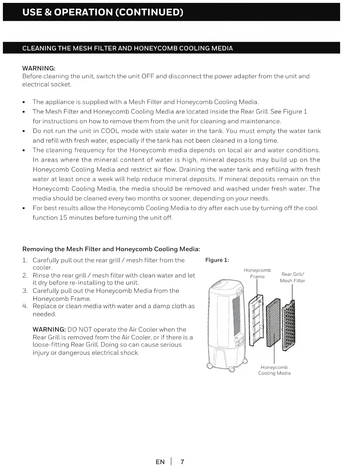 L'appareil est vendu avec un filtre et un système de refroidissement en nid d'abeilles. - Le filtre et le système de refroidissement en nid d'abeilles se trouvent derrière la grille arrière. Pour savoir comment les retirer de l'appareil en vue de leur nettoyage et de leur entretien, consulter la figure 1. - Ne pas faire fonctionner l'unité en mode REFROIDISSEMENT quand de l'eau stagnante se trouve dans le réservoir. Vous devez voir l'eau et la remplacer par de l'eau propre, surtout si le réservoir n'a pas été nettoyé depuis longtemps. - La fréquence de nettoyage du système en nid d'abeilles dépend de l'état de l'eau et de l'air. Dans les régions où l'eau est riche en minéraux, des dépôts peuvent s'accumuler sur le système de refroidissement en nid d'abeilles et nuire à la circulation d'air. Vider le réservoir d'eau et le remplir d'eau propre au moins une fois par semaine contribuera à réduire les dépôts de minéraux. Si les dépôts de minéraux subsistent sur le système de refroidissement en nid d'abeilles, le système devra être retiré et lavé avec de l'eau propre. Le système devra être nettoyé tous les deux mois ou plus souvent, selon le besoin. - Pour obtenir les meilleurs résultats, laisser sécher le système de refroidissement en nid d'abeilles après chaque utilisation en éteignant la fonction REFROIDISSEMENT pendant 15 minutes avant d'éteindre l'appareil.