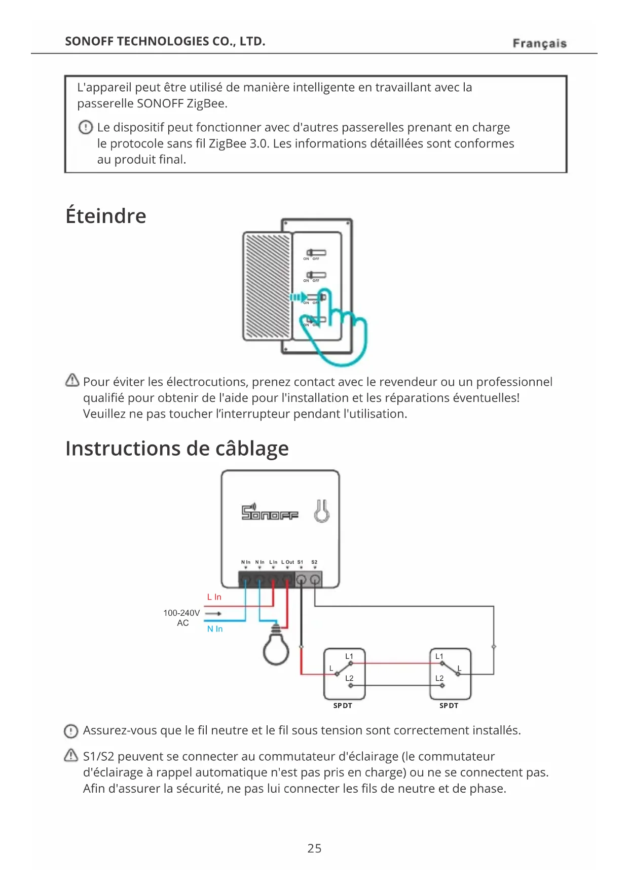 SPDT L'appareil peut être utilisé de manière intelligente en travaillant avec la passerelle SONOFF ZigBee. Le dispositif peut fonctionner avec d'autres passerelles prenant en charge le protocole sans fil ZigBee 3.0. Les informations détaillées sont conformes au produit final. Éteindre Pour éviter les électrocutions, prenez contact avec le revendeur ou un professionnel qualifié pour obtenir de l'aide pour l'installation et les réparations éventuelles! Veuillez ne pas toucher l’interrupteur pendant l'utilisation. Instructions de câblage Assurez-vous que le fil neutre et le fil sous tension sont correctement installés. S1/S2 peuvent se connecter au commutateur d'éclairage (le commutateur d'éclairage à rappel automatique n'est pas pris en charge) ou ne se connectent pas. Afin d'assurer la sécurité, ne pas lui connecter les fils de neutre et de phase. 25Amazon Alexa