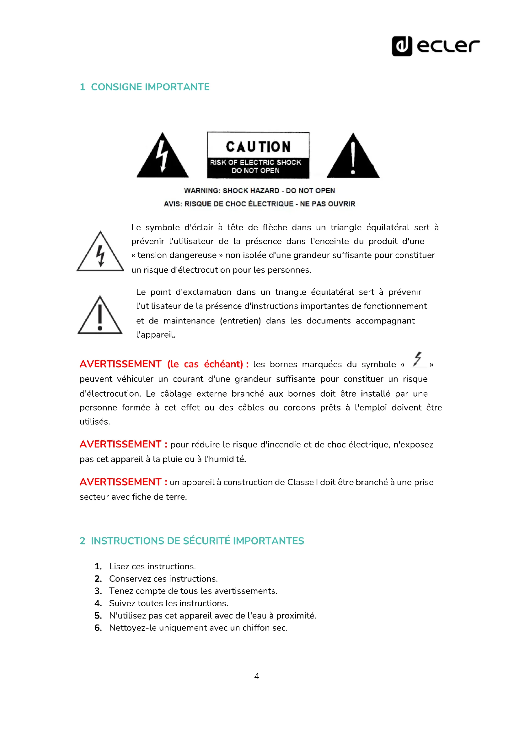 Le symbole d'éclair à tête de flèche dans un triangle équilatéral sert à prévenir l'utilisateur de la présence dans l'enceinte du produit d'une « tension dangereuse » non isolée d'une grandeur suffisante pour constituer un risque d'électrocution pour les personnes. Le point d'exclamation dans un triangle équilatéral sert à prévenir l'utilisateur de la présence d'instructions importantes de fonctionnement et de maintenance (entretien) dans les documents accompagnant l'appareil. AVERTISSEMENT (le cas échéant) : les bornes marquées du symbole « » peuvent véhiculer un courant d'une grandeur suffisante pour constituer un risque d'électrocution. Le câblage externe branché aux bornes doit être installé par une personne formée à cet effet ou des câbles ou cordons prêts à l'emploi doivent être utilisés.