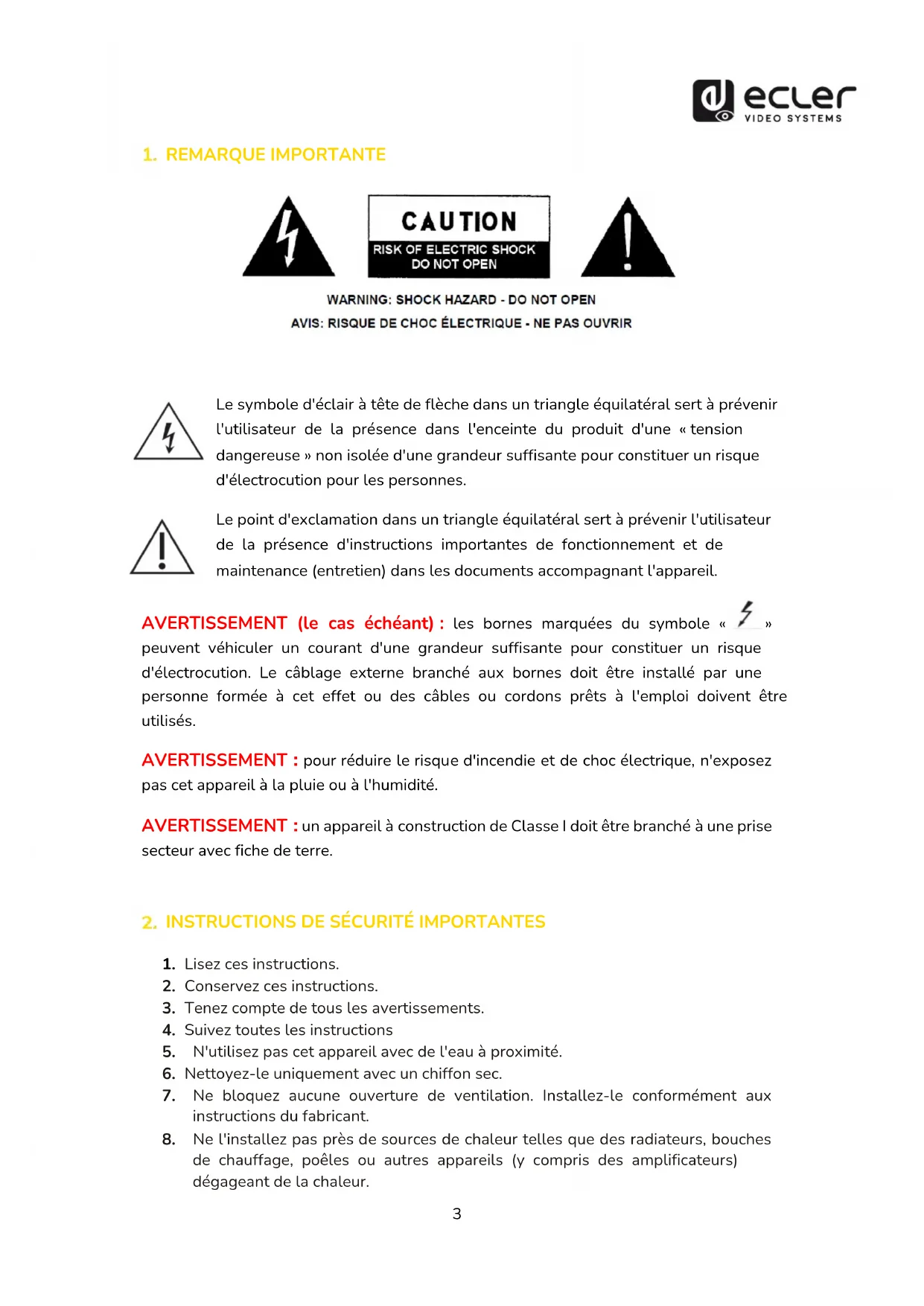 Le symbole d'éclair à tête de flèche dans un triangle équilatéral sert à prévenir l'utilisateur de la présence dans l'enceinte du produit d'une « tension dangereuse » non isolée d'une grandeur suffisante pour constituer un risque d'électrocution pour les personnes. Le point d'exclamation dans un triangle équilatéral sert à prévenir l'utilisateur de la présence d'instructions importantes de fonctionnement et de maintenance (entretien) dans les documents accompagnant l'appareil. AVERTISSEMENT (le cas échéant) : les bornes marquées du symbole « » peuvent véhiculer un courant d'une grandeur suffisante pour constituer un risque d'électrocution. Le câblage externe branché aux bornes doit être installé par une personne formée à cet effet ou des câbles ou cordons prêts à l'emploi doivent être utilisés.