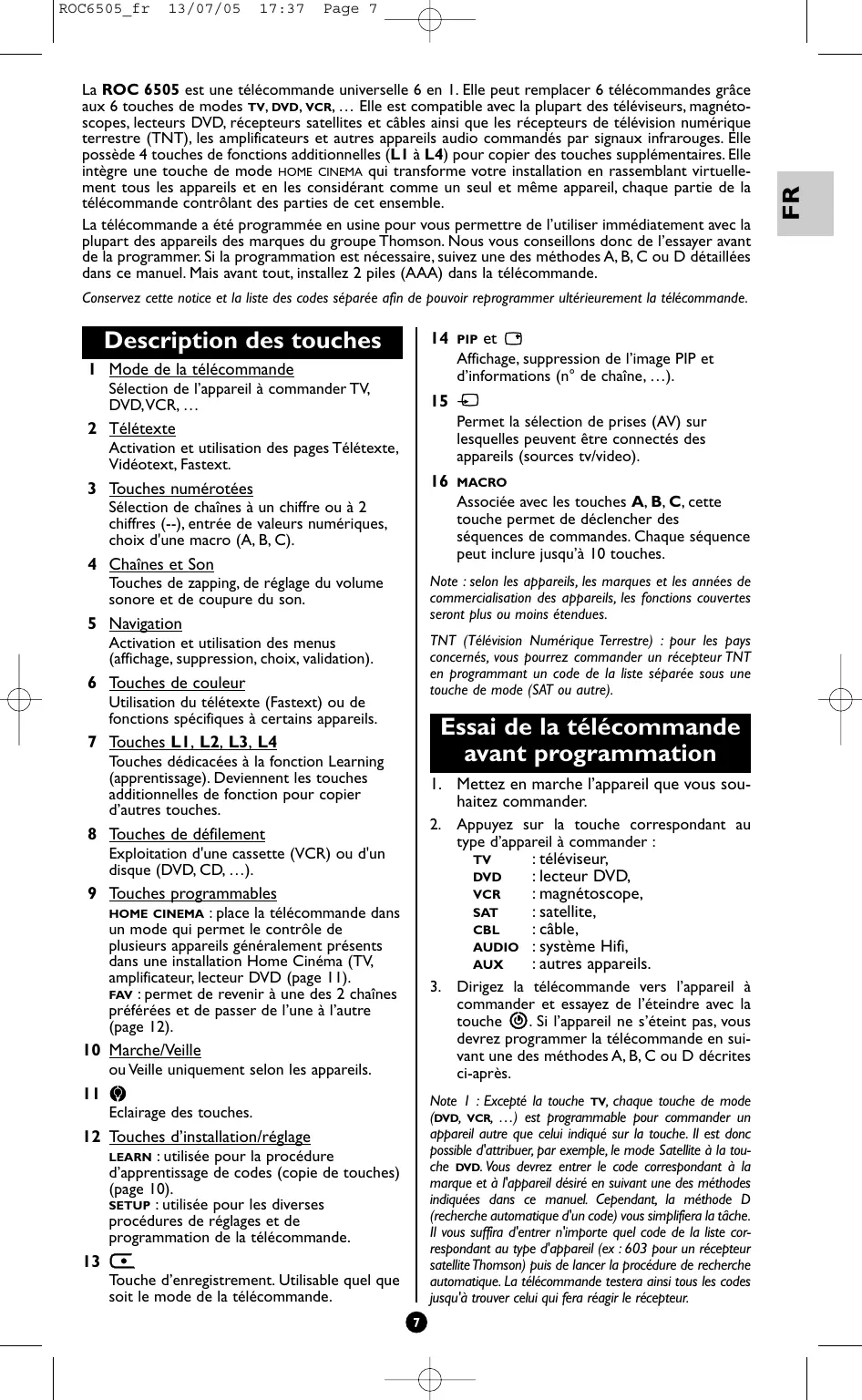 13/07/05 17:37 Page 7 La ROC 6505 est une télécommande universelle 6 en 1. Elle peut remplacer 6 télécommandes grâce aux 6 touches de modes TV, DVD, VCR, … Elle est compatible avec la plupart des téléviseurs, magnétoscopes, lecteurs DVD, récepteurs satellites et câbles ainsi que les récepteurs de télévision numérique terrestre (TNT), les amplificateurs et autres appareils audio commandés par signaux infrarouges. Elle possède 4 touches de fonctions additionnelles (L1 à L4) pour copier des touches supplémentaires. Elle intègre une touche de mode HOME CINEMA qui transforme votre installation en rassemblant virtuellement tous les appareils et en les considérant comme un seul et même appareil, chaque partie de la télécommande contrôlant des parties de cet ensemble. La télécommande a été programmée en usine pour vous permettre de l’utiliser immédiatement avec la plupart des appareils des marques du groupe Thomson. Nous vous conseillons donc de l’essayer avant de la programmer. Si la programmation est nécessaire, suivez une des méthodes A, B, C ou D détaillées dans ce manuel. Mais avant tout, installez 2 piles (AAA) dans la télécommande. Conservez cette notice et la liste des codes séparée afin de pouvoir reprogrammer ultérieurement la télécommande. Description des touches