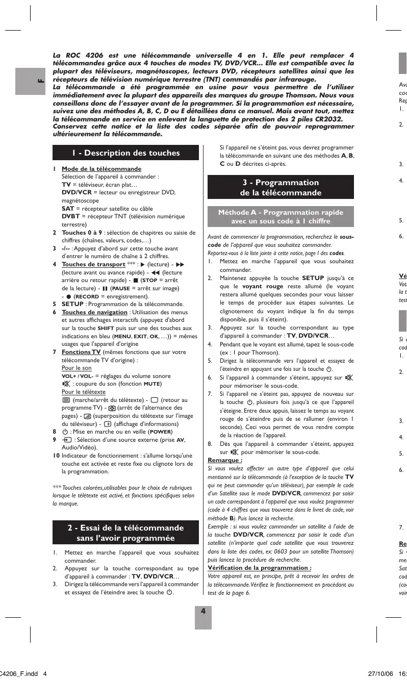 La ROC 4206 est une télécommande universelle 4 en 1. Elle peut remplacer 4 télécommandes grâce aux 4 touches de modes TV, DVD/VCR… Elle est compatible avec la plupart des téléviseurs, magnétoscopes, lecteurs DVD, récepteurs satellites ainsi que les récepteurs de télévision numérique terrestre (TNT) commandés par infrarouge. La télécommande a été programmée en usine pour vous permettre de l’utiliser immédiatement avec la plupart des appareils des marques du groupe Thomson. Nous vous conseillons donc de l’essayer avant de la programmer. Si la programmation est nécessaire, suivez une des méthodes A, B, C, D ou E détaillées dans ce manuel. Mais avant tout, mettez la télécommande en service en enlevant la languette de protection des 2 piles CR2032. Conservez cette notice et la liste des codes séparée afin de pouvoir reprogrammer ultérieurement la télécommande. Si l’appareil ne s’éteint pas, vous devrez programmer la télécommande en suivant une des méthodes A, B, C ou D décrites ci-après.