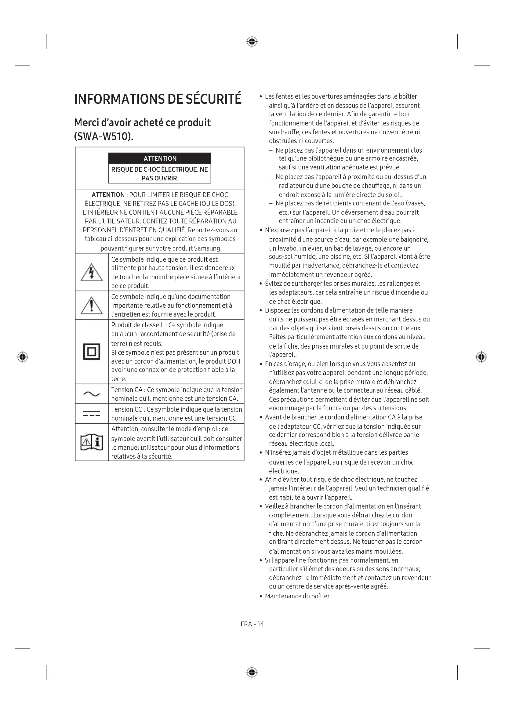 PAS OUVRIR. ATTENTION : POUR LIMITER LE RISQUE DE CHOC ÉLECTRIQUE, NE RETIREZ PAS LE CACHE (OU LE DOS). L’INTÉRIEUR NE CONTIENT AUCUNE PIÈCE RÉPARABLE PAR L’UTILISATEUR. CONFIEZ TOUTE RÉPARATION AU PERSONNEL D’ENTRETIEN QUALIFIÉ. Reportez-vous au tableau ci-dessous pour une explication des symboles pouvant gurer sur votre produit Samsung. Ce symbole indique que ce produit est alimenté par haute tension. Il est dangereux de toucher la moindre pièce située à l’intérieur de ce produit. Ce symbole indique qu’une documentation importante relative au fonctionnement et à l’entretien est fournie avec le produit. Produit de classe II : Ce symbole indique qu'aucun raccordement de sécurité (prise de terre) n'est requis. Si ce symbole n’est pas présent sur un produit avec un cordon d’alimentation, le produit DOIT avoir une connexion de protection able à la terre. Tension CA : Ce symbole indique que la tension nominale qu'il mentionne est une tension CA. Tension CC : Ce symbole indique que la tension nominale qu'il mentionne est une tension CC. Attention, consulter le mode d’emploi : ce symbole avertit l’utilisateur qu’il doit consulter le manuel utilisateur pour plus d’informations relatives à la sécurité.