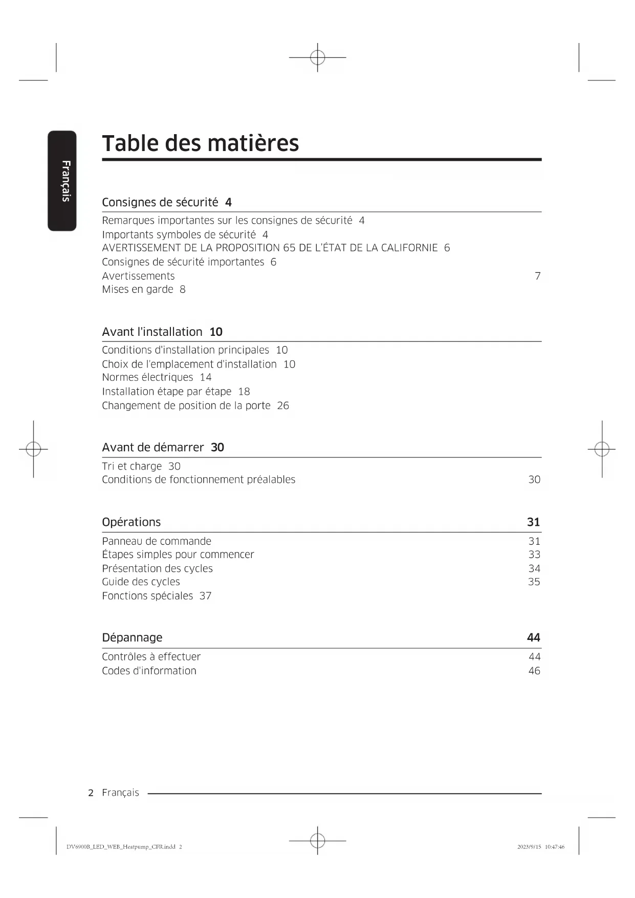 Français Table des matières Consignes de sécurité 4 Remarques importantes sur les consignes de sécurité 4 Importants symboles de sécurité 4 AVERTISSEMENT DE LA PROPOSITION 65 DE L’ÉTAT DE LA CALIFORNIE 6 Consignes de sécurité importantes 6 Avertissements 7 Mises en garde 8 Avant l'installation 10 Conditions d'installation principales 10 Choix de l'emplacement d'installation 10 Normes électriques 14 Installation étape par étape 18 Changement de position de la porte 26 Avant de démarrer 30 Tri et charge 30 Conditions de fonctionnement préalables 30 Opérations 31 Panneau de commande 31 Étapes simples pour commencer 33 Présentation des cycles 34 Guide des cycles 35 Fonctions spéciales 37 Dépannage 44 Contrôles à effectuer 44 Codes d'information 46 DV6900B_LED_WEB_Heatpump_CFR.indd 2DV6900B_LED_WEB_Heatpump_CFR.indd 2 2023/9/15 10:47:462023/9/15 10:47:46Français