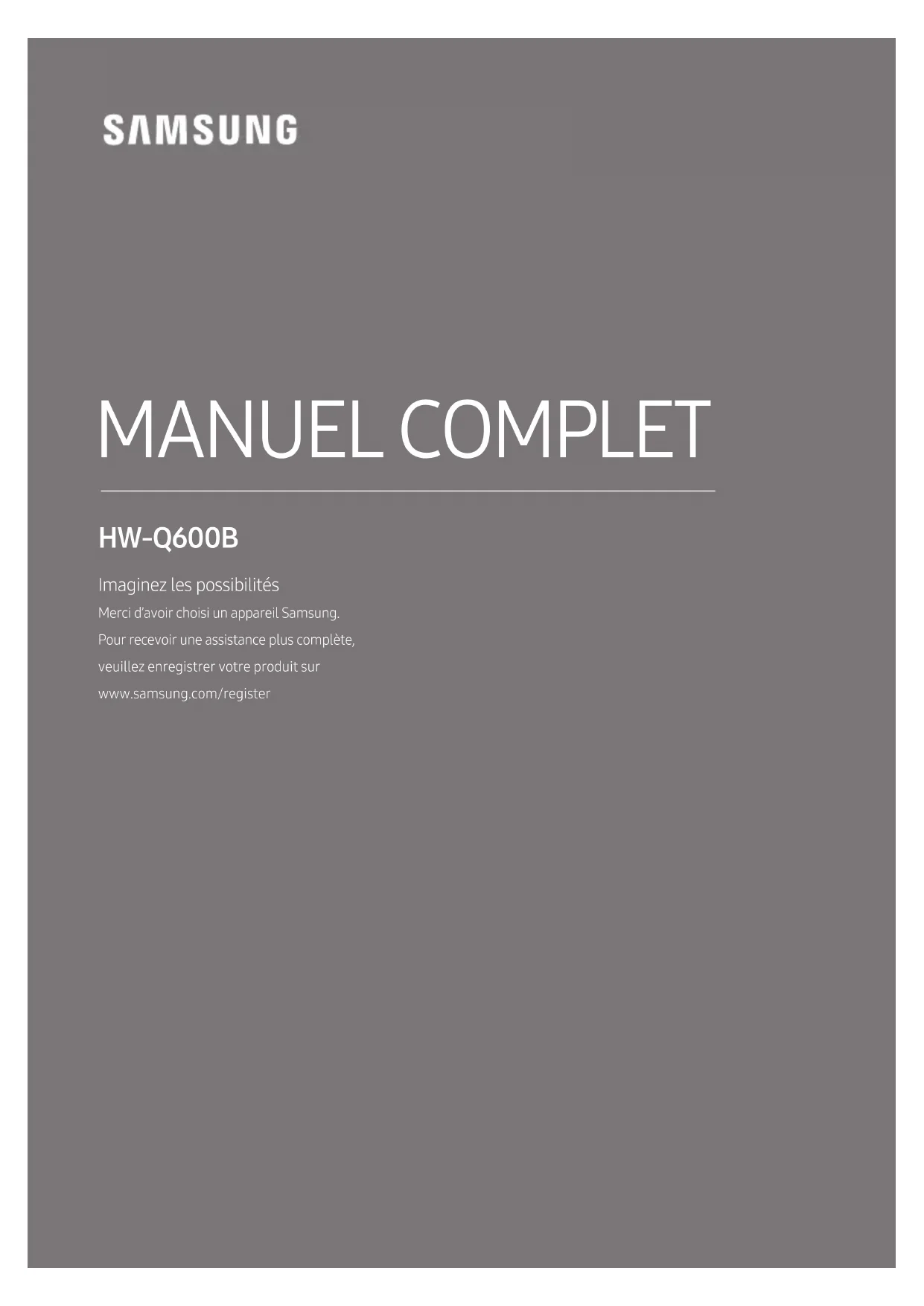 North America CANADA 1-800-SAMSUNG (726-7864) www.samsung.com/ca/support (English) www.samsung.com/ca_fr/support (French) U.S.A 1-800-SAMSUNG (726-7864) www.samsung.com/us/supportHW-Q600B MANUEL COMPLET Imaginez les possibilités Merci d’avoir choisi un appareil Samsung. Pour recevoir une assistance plus complète, veuillez enregistrer votre produit sur www.samsung.com/registerFRA - 2