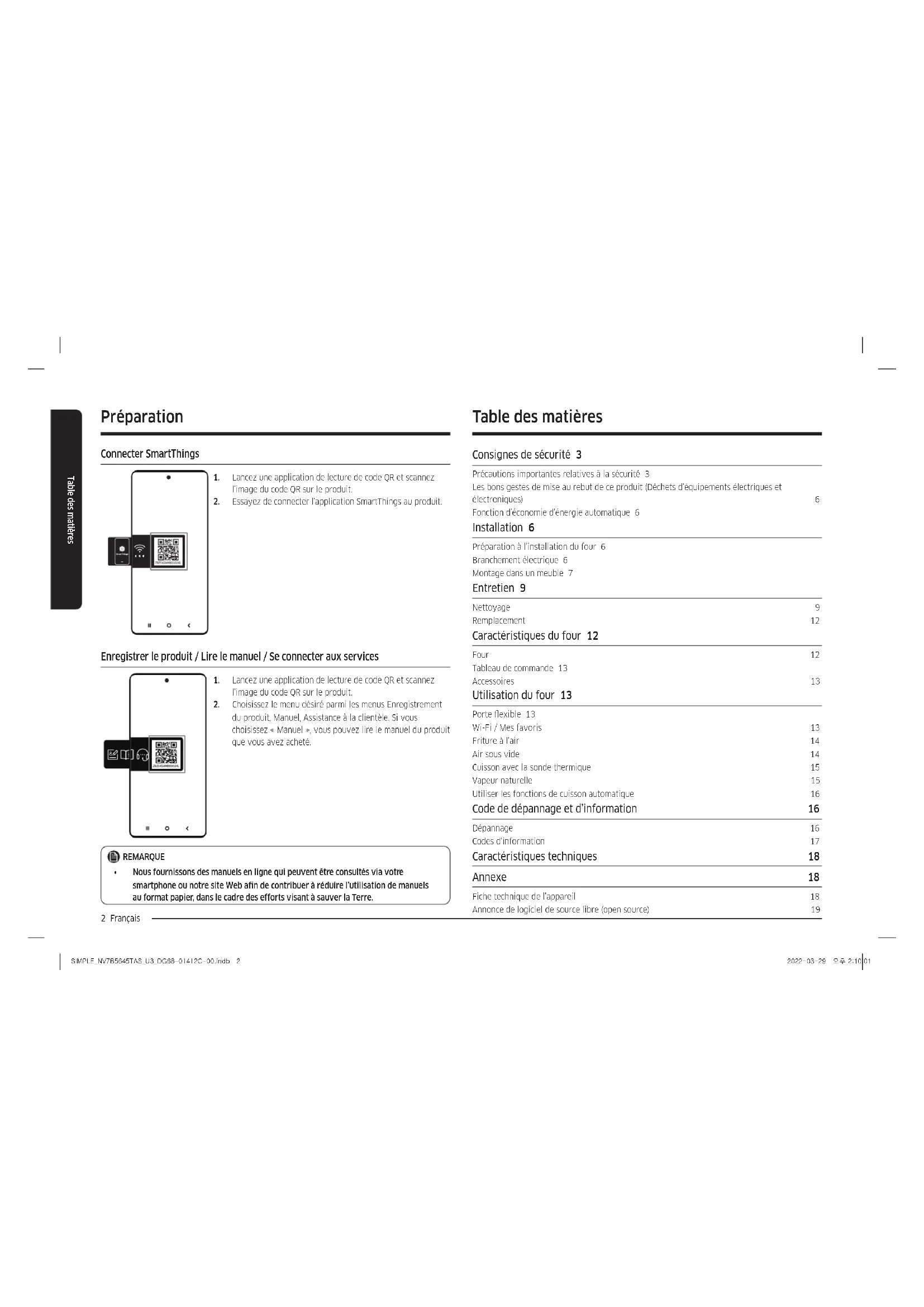 - Pour les instructions d’utilisation du produit, veuillez consulter les manuels d’utilisation fournis sous forme de code QR ou le site Web de Samsung Electronics (https://www.samsung.com). Scannez ceci avec votre smartphone. SIMPLE_NV7B5645TAS_U3_DG68-01412C-00.indb 1SIMPLE_NV7B5645TAS_U3_DG68-01412C-00.indb 1 2022-03-29 오후 2:10:012022-03-29 오후 2:10:012 Français Table des matières Table des matières Table des matières Consignes de sécurité 3 Précautions importantes relatives à la sécurité 3 Les bons gestes de mise au rebut de ce produit (Déchets d’équipements électriques et électroniques) 6 Fonction d’économie d’énergie automatique 6 Installation 6 Préparation à l’installation du four 6 Branchement électrique 6 Montage dans un meuble 7 Entretien 9 Nettoyage 9 Remplacement 12 Caractéristiques du four 12 Four 12 Tableau de commande 13 Accessoires 13 Utilisation du four 13 Porte exible 13 Wi-Fi / Mes favoris 13 Friture à l’air 14 Air sous vide 14 Cuisson avec la sonde thermique 15 Vapeur naturelle 15 Utiliser les fonctions de cuisson automatique 16 Code de dépannage et d’information 16 Dépannage 16 Codes d’information 17 Caractéristiques techniques 18